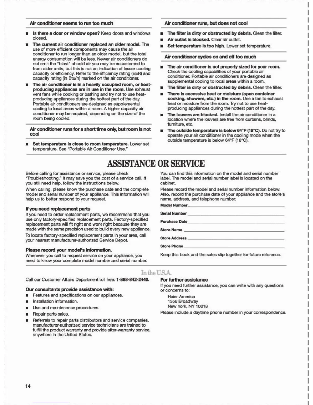 Amana APN14J-E - Air Conditioner Performance Issues; Air Conditioner Runs Short Time, Room Not Cool; Air Conditioner Runs, But Does Not Cool; Air Conditioner Cycles On and Off Too Much