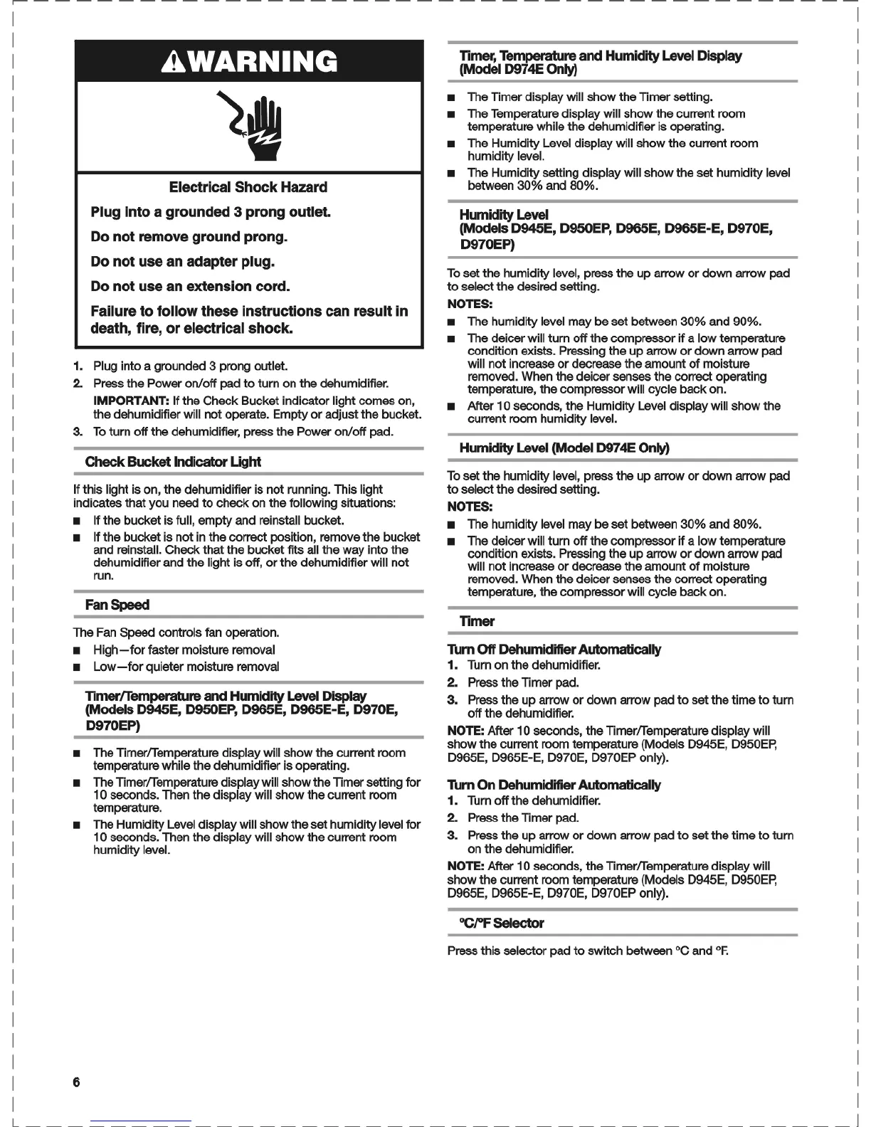 Amana D945E - Control Settings; Timer, Temperature & Humidity Level Display; Check Bucket Indicator Light; Fan Speed