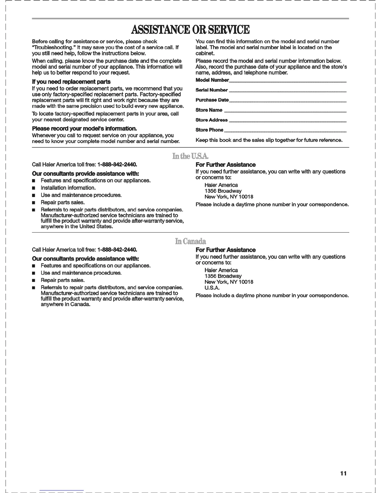 Amana D970EP - Assistance or Service; Assistance in the U.S.A.; Assistance in Canada