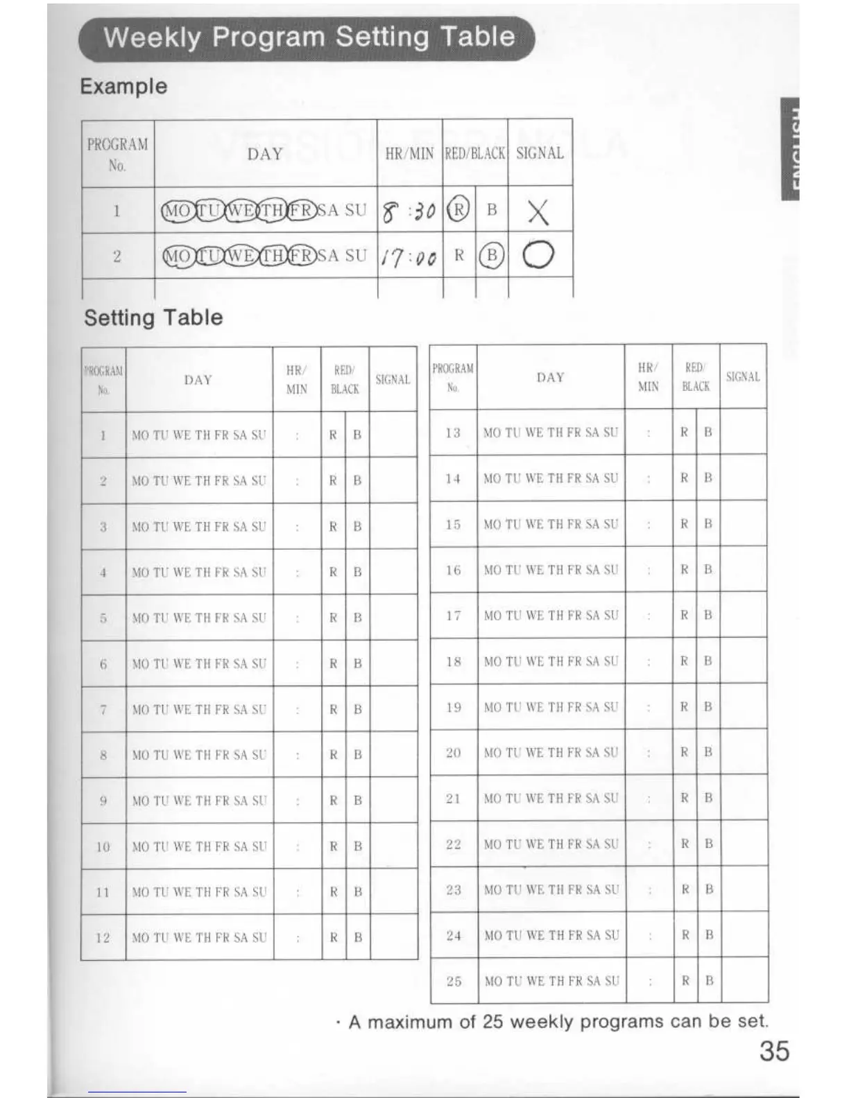Amano EX3000N - WEEKLY PROGRAM SETTING TABLE