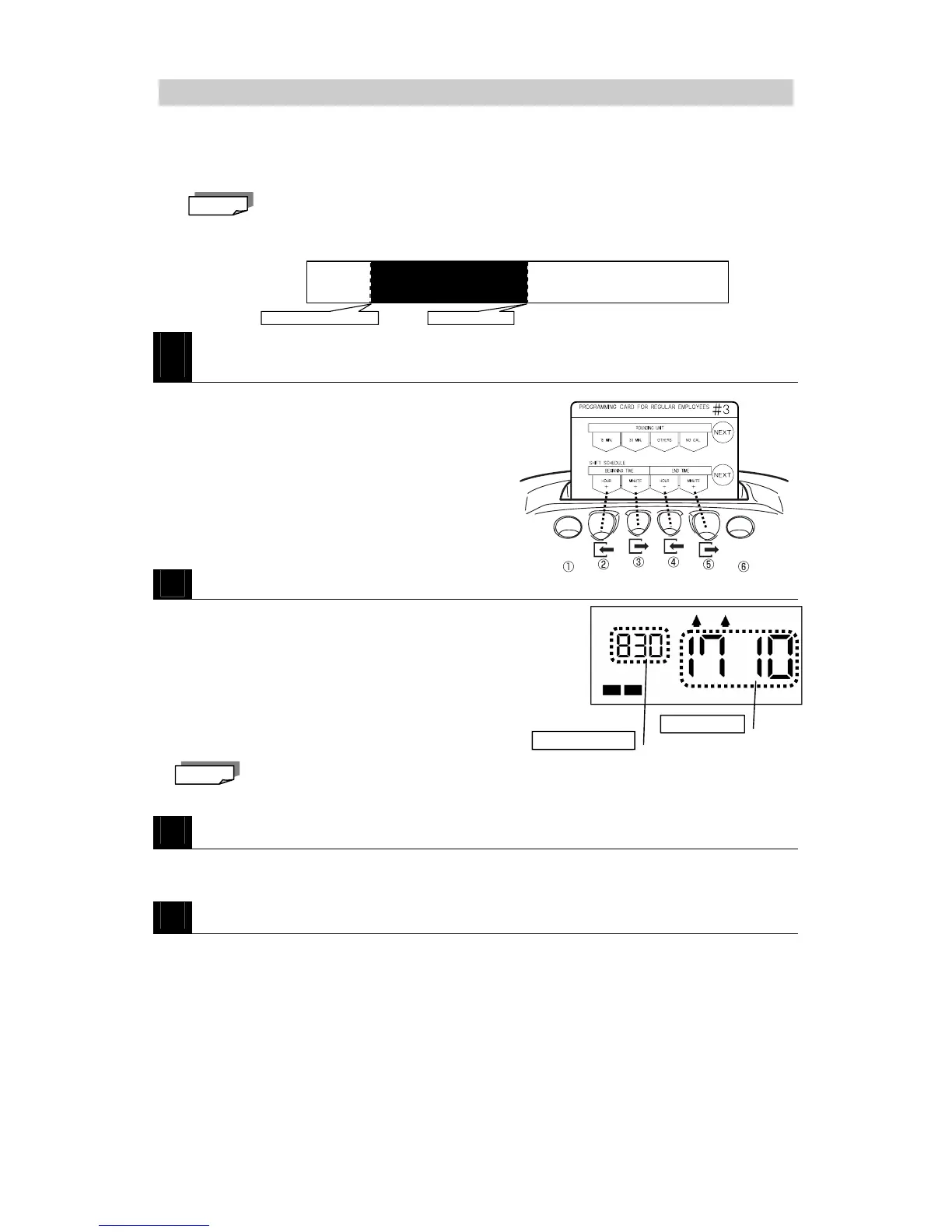 ・Press MINUTE + (button ⑤) to increase the Shift End Time