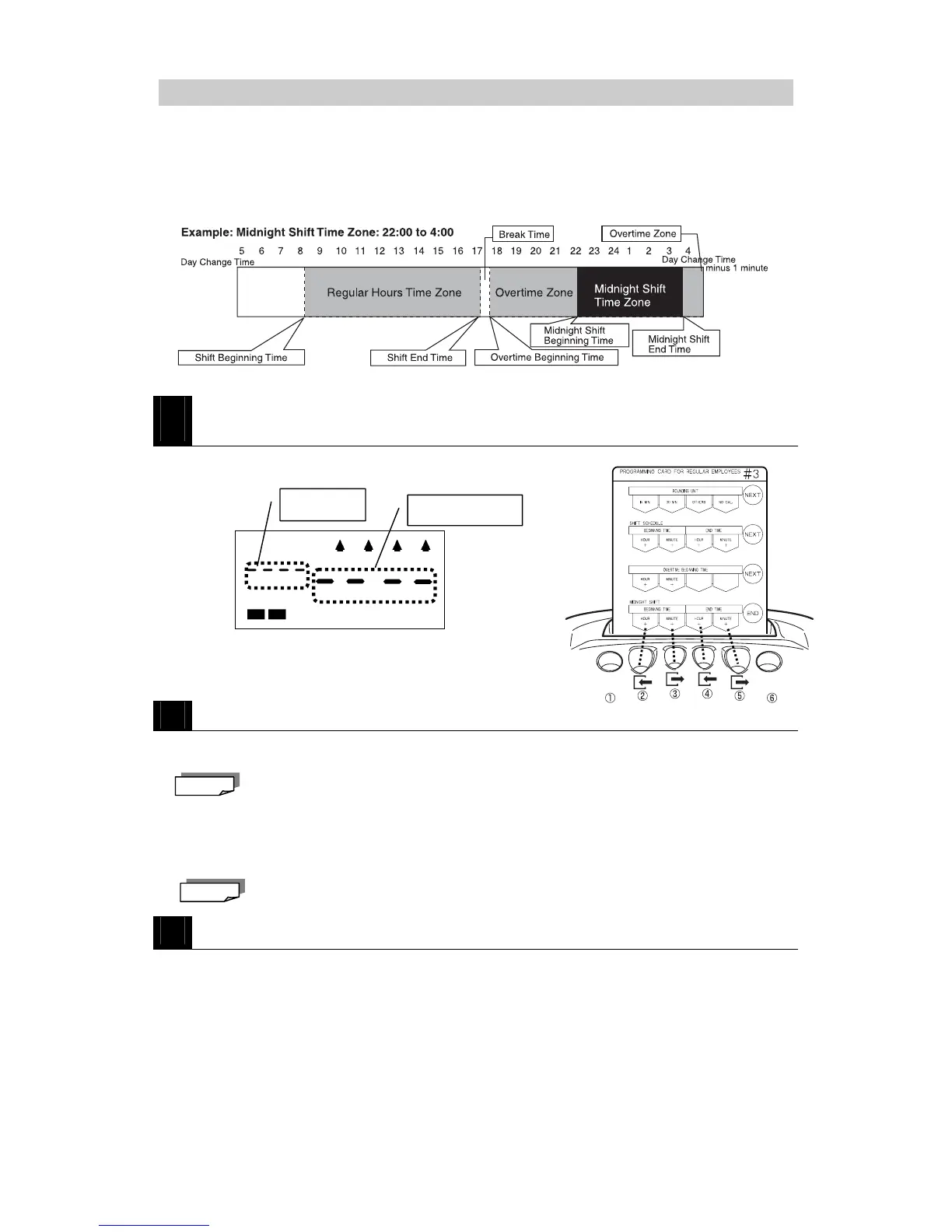 ・Press MINUTE + (button ⑤) to increase the Midnight Shift End Time one minute at a