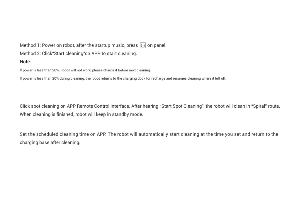 If power is less than 20%, Robot will not work, please charge it before next cleaning.