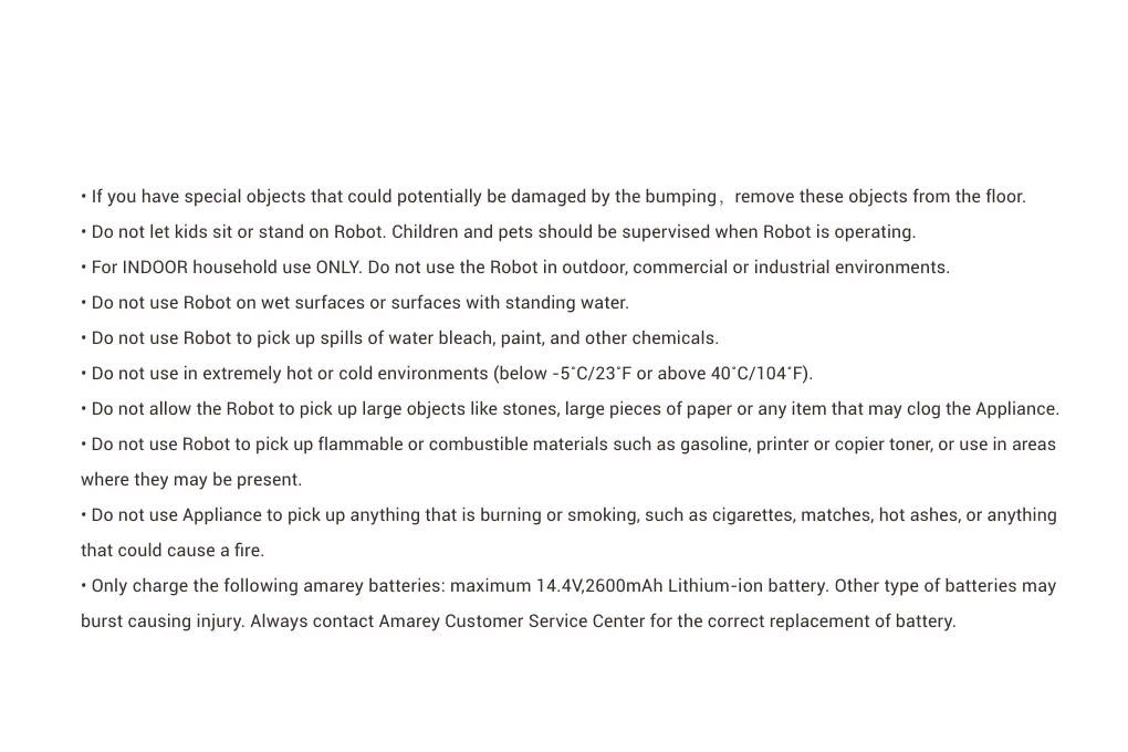 • Do not use Robot to pick up spills of water bleach, paint, and other chemicals.