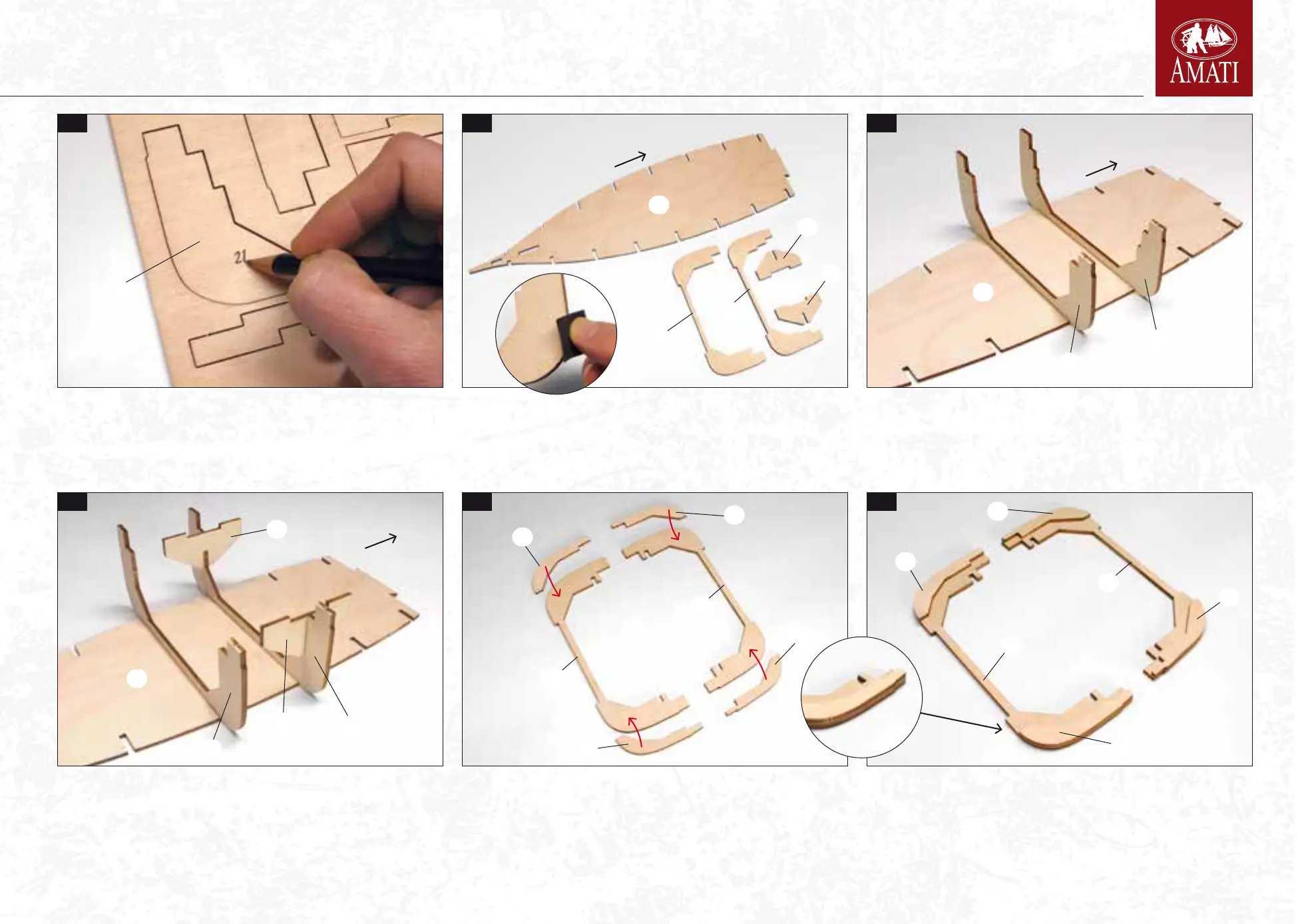 006 Perform tests without glue; then, glue the supports to the bulkheads.005 Remove from sheets 3551 and 3550 the two bulkheads 19 and 23 with the re-