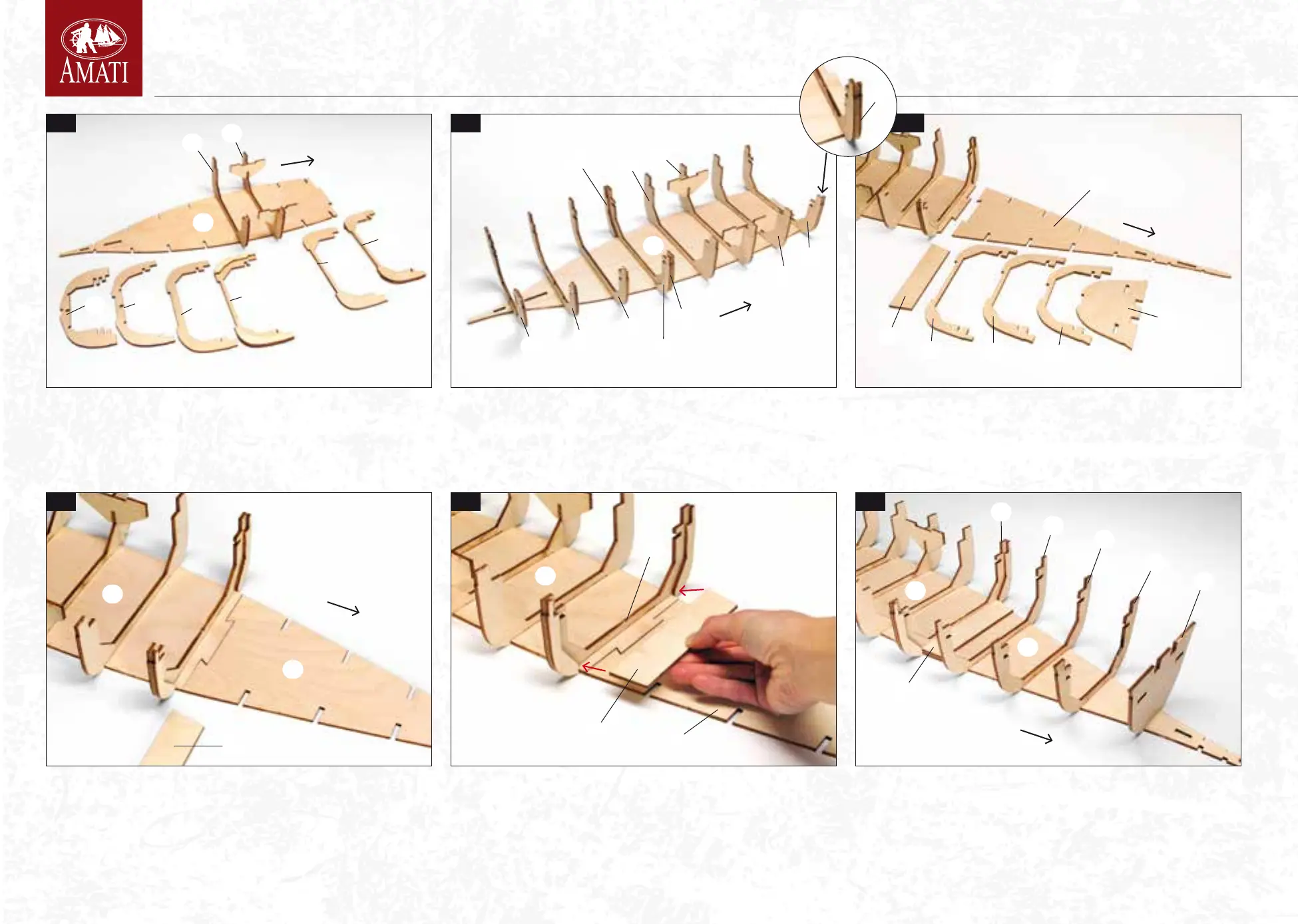 010 Try inserting keel 2 in the bow joint of keel 1; then glue with wood glue. 012 Move forward and try assembling bulkheads 18, 17, 16, 15 in the joints of keel