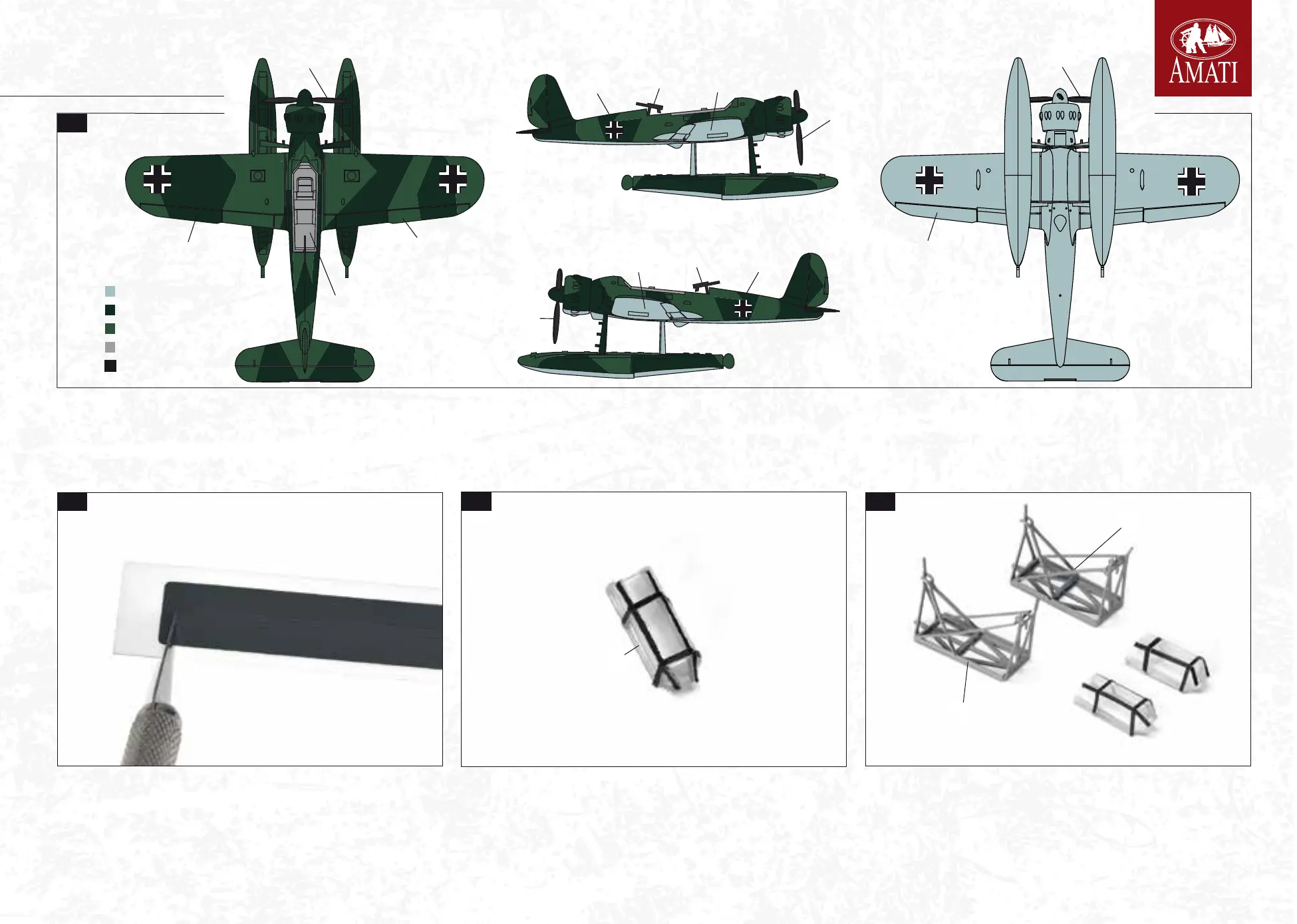 and with RLM 72 dark green for the camouage colouring steps following the colour areas shown in the picture in the drawing. Repeat the colouring steps for the second Arado as well. When the colour is perfectly dry, you can proceed with setting up the seaplanes