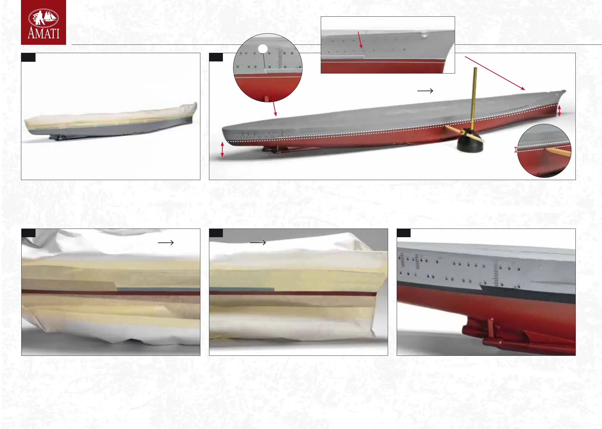 170 Using Ral 8012 brown red colour paint, colour the part of the hull located below the water line. Warning! Let the paint dry well, then remove the paper and the paper