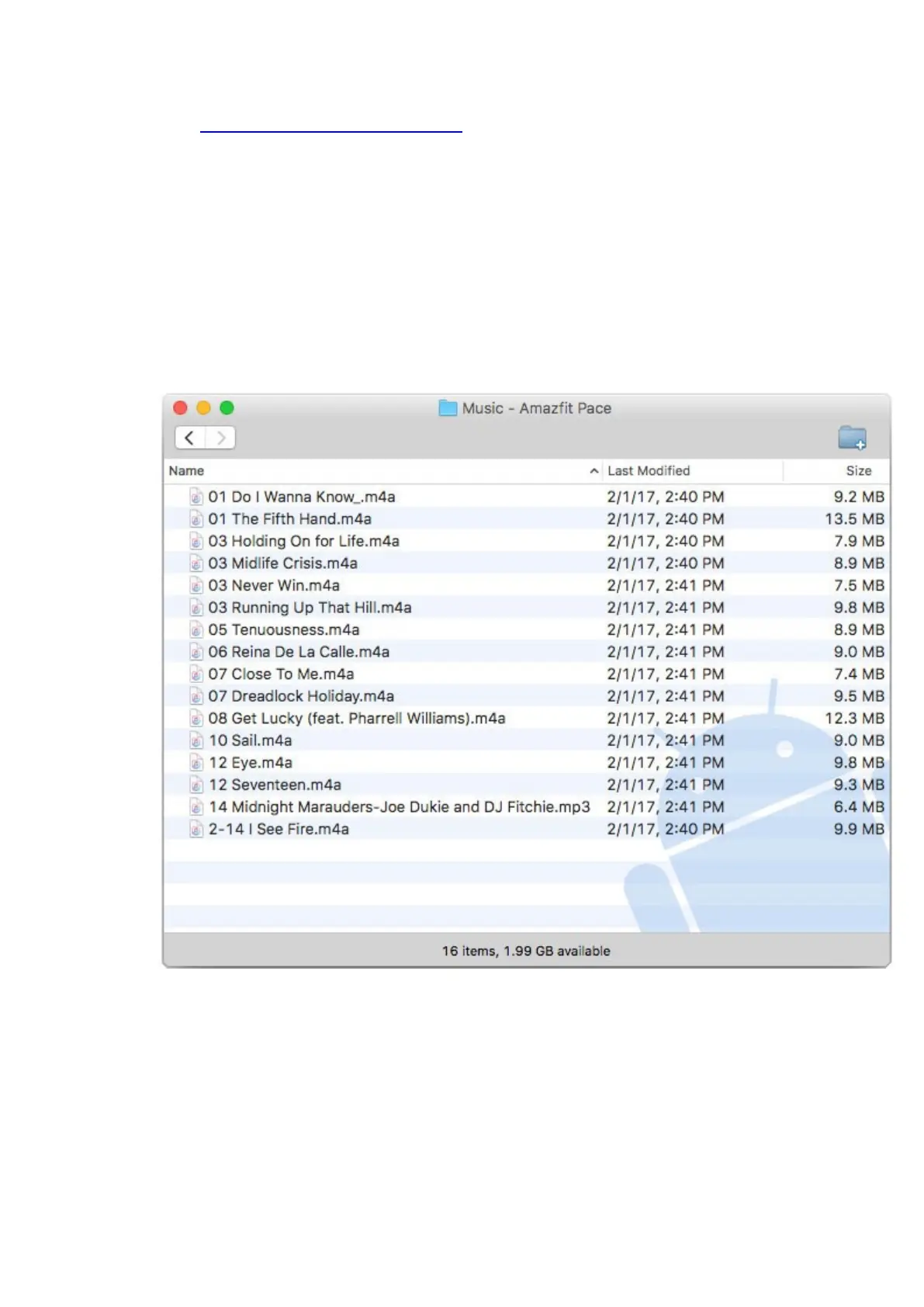 4. Double click on the "Music" file folder shown in Android File Transfer.