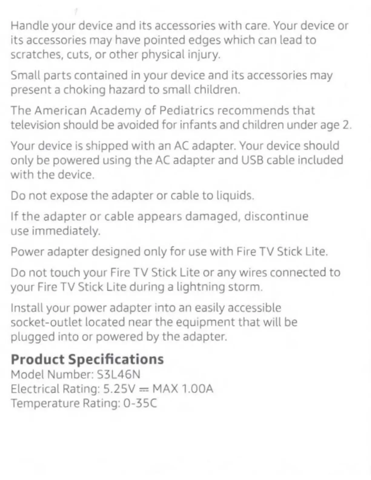 Amazon Fire TV Stick Lite - Product Handling and Specifications; Device Handling and Injury Prevention; Power Adapter and Storm Safety