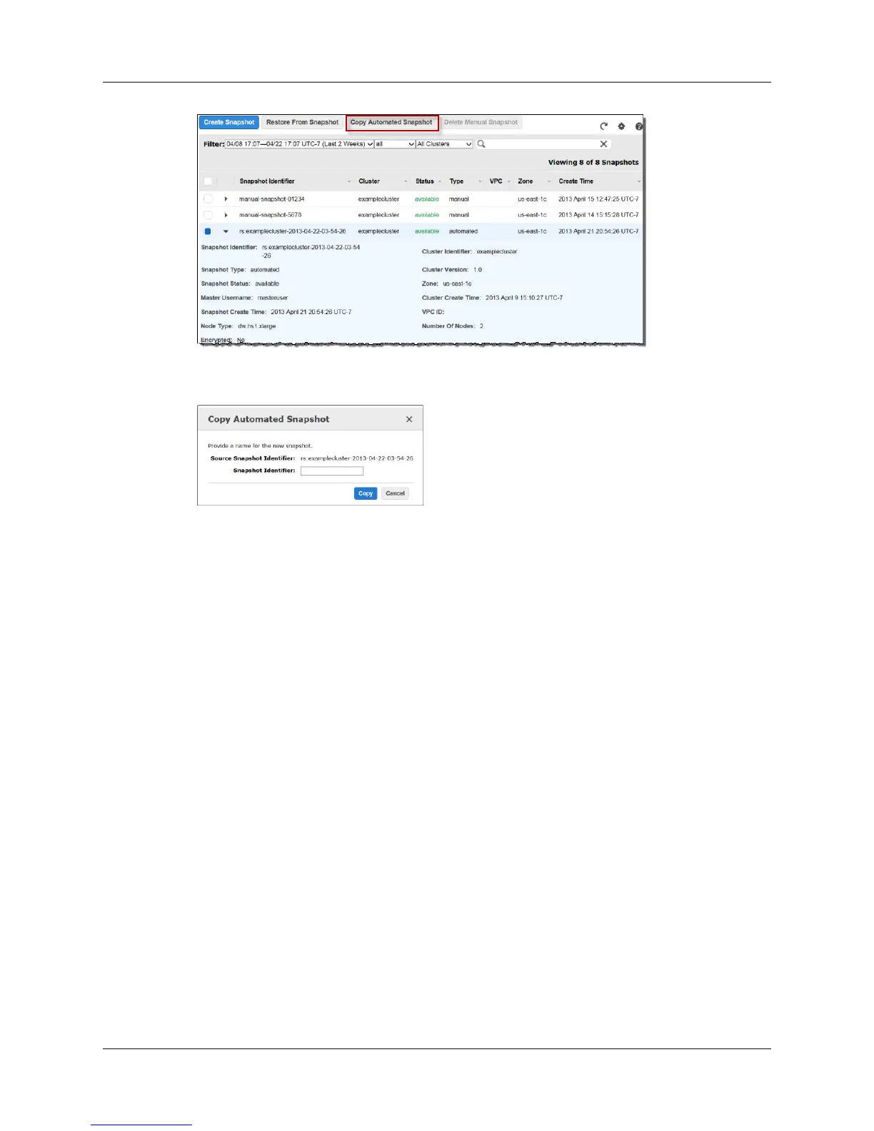 • In the Cluster box, click the cluster whose snapshot you want to copy.