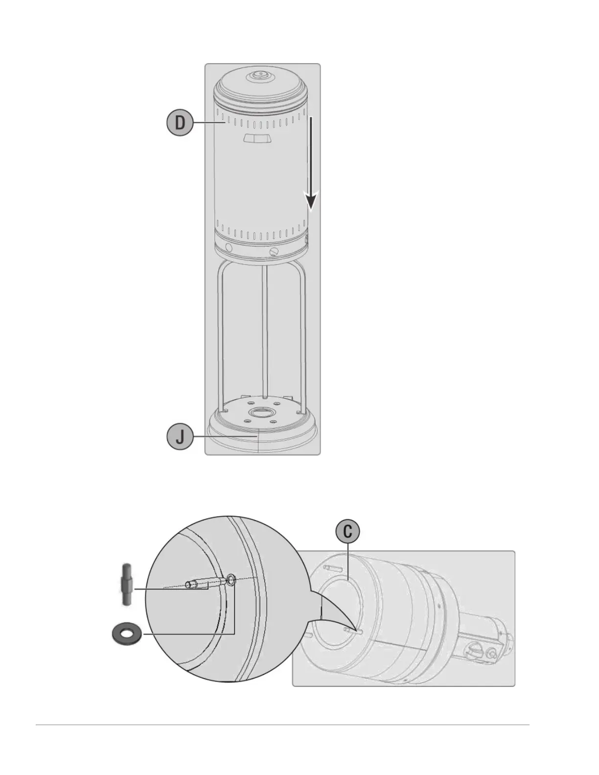 Step 6: Insert the tank housing (D) onto the upper post and lower it until it rests on the base.