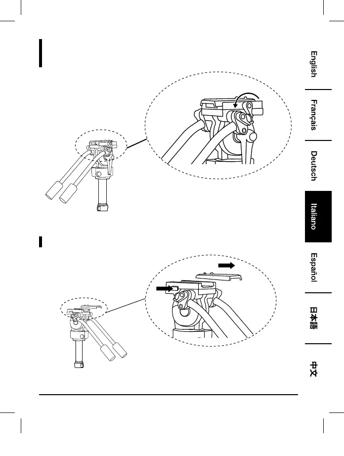 Spingere il fermo di sicurezza e far scorrere la piastra di montaggio a sgancio rapido fuori dal