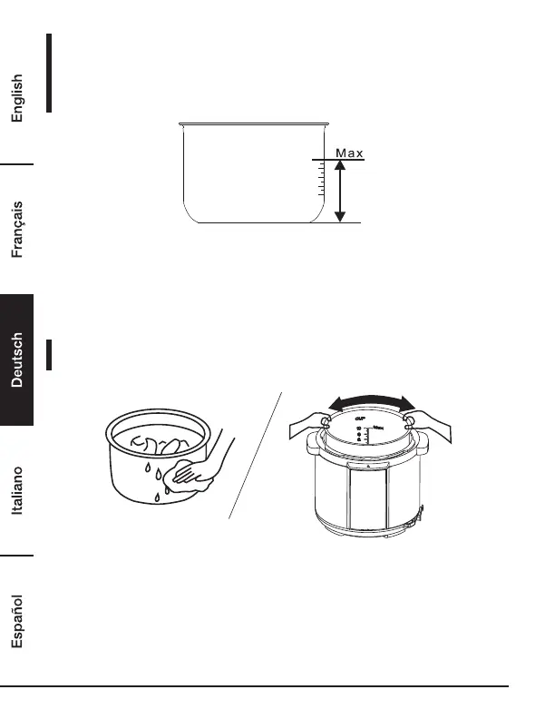 • Die Gesamtmenge an Lebensmitteln und Wasser darf die „Max“-Markierung im Innentopf nicht