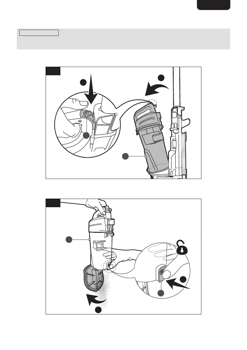 2� Tenez le bac à poussière (11) au-dessus d'une poubelle, puis appuyez sur le bouton de