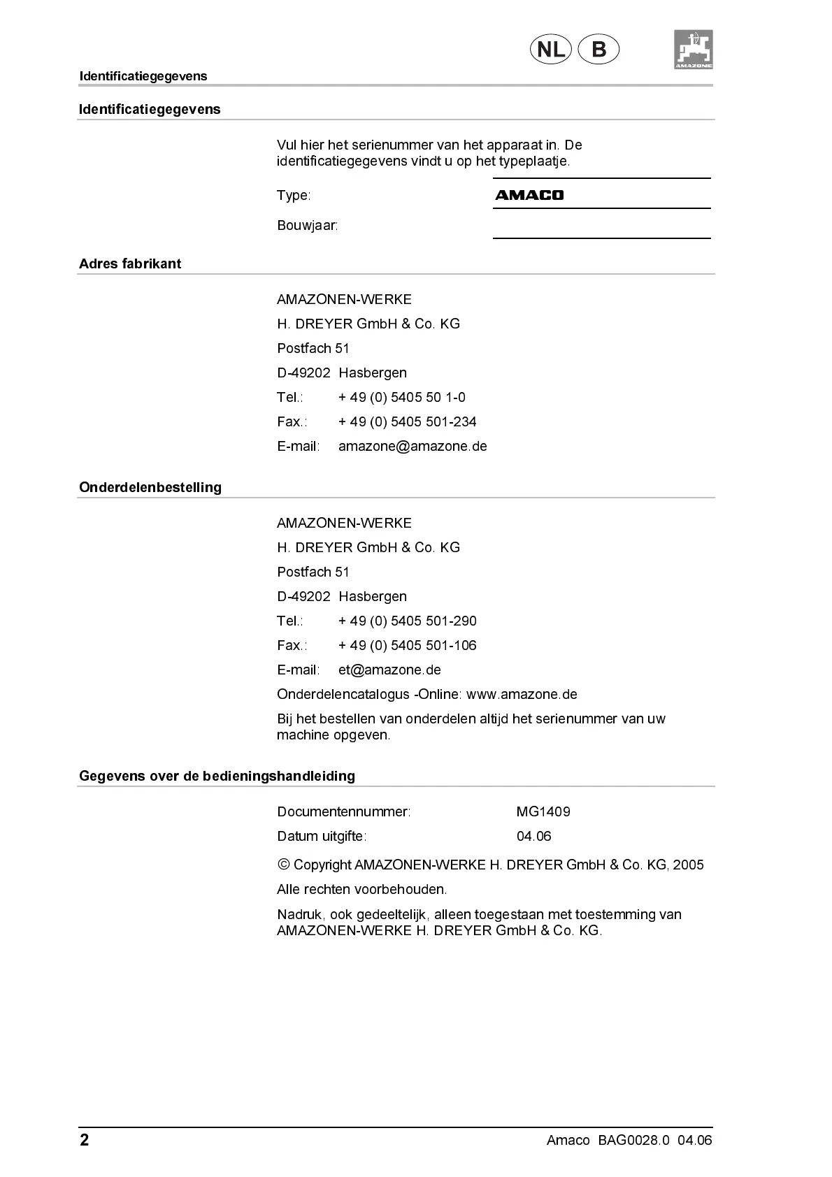 Onderdelencatalogus -Online: www.amazone.de
