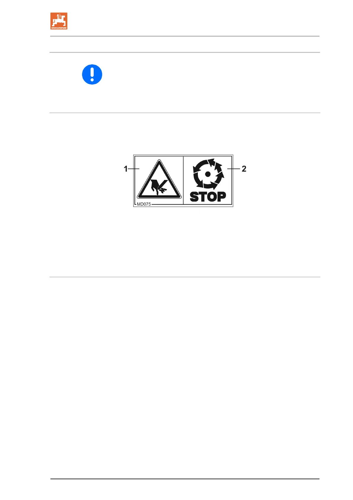 Warning symbols indicate danger areas on the implement and warn against residual dangers. At these
