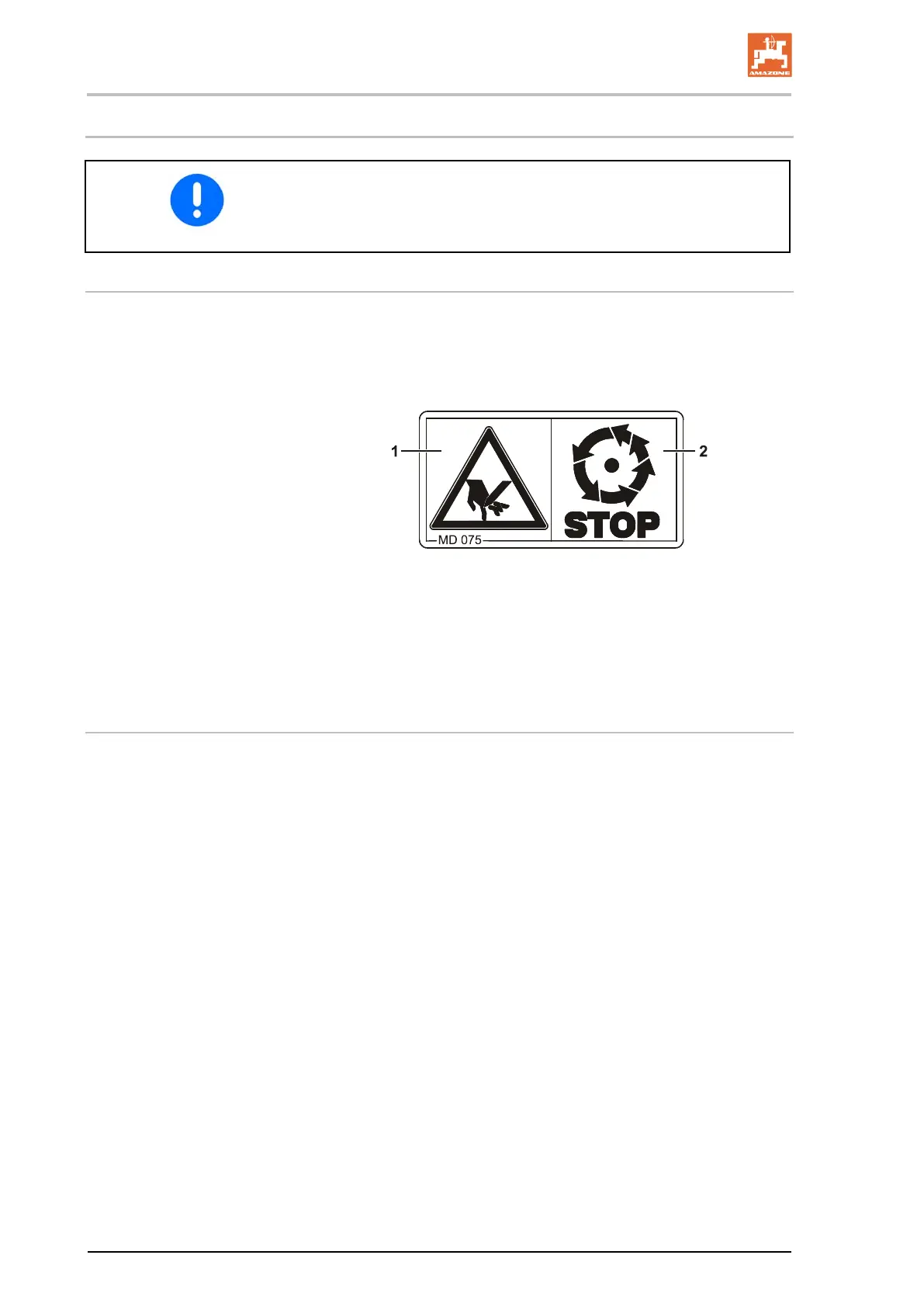 Warning pictograms indicate danger areas on the implement and
