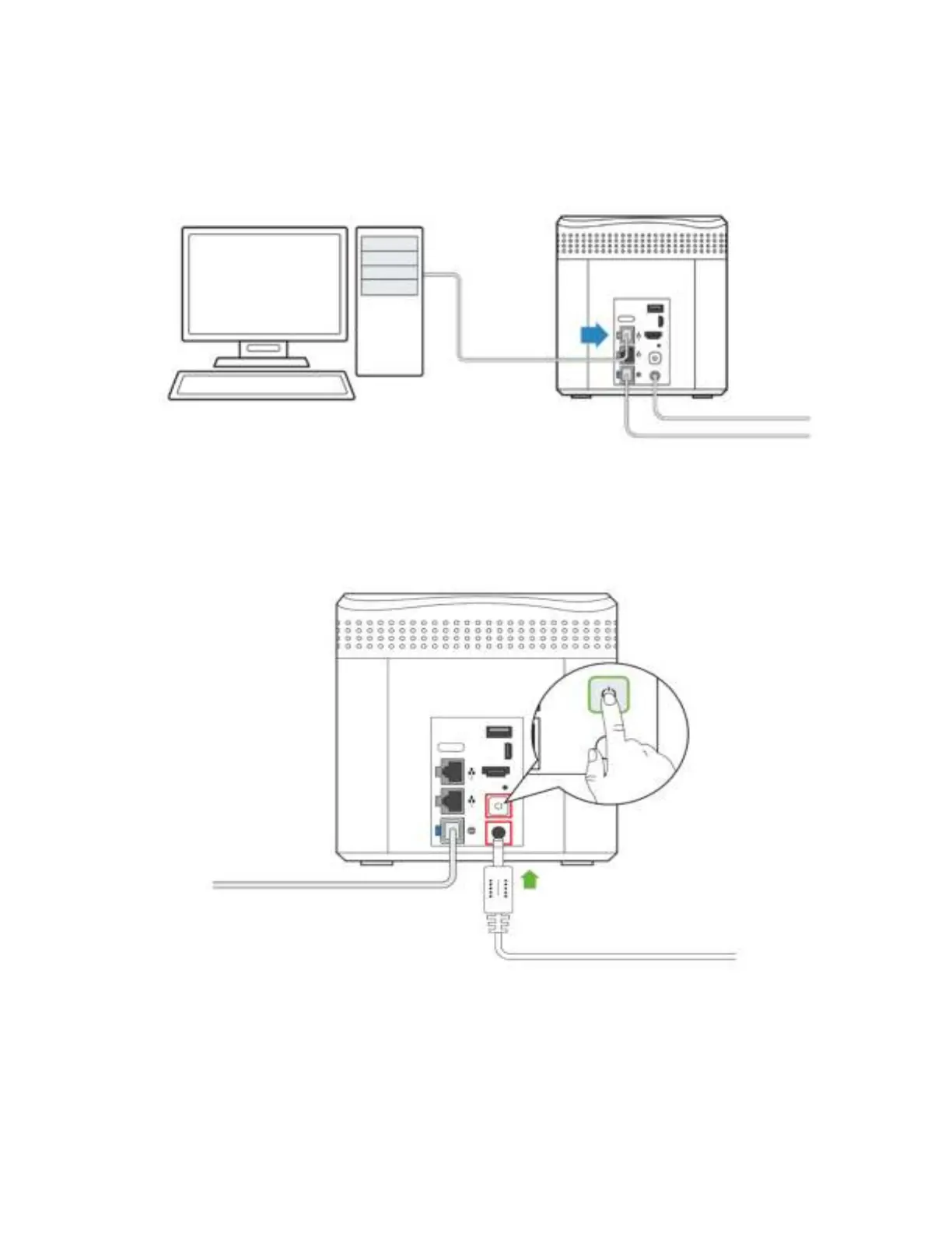 Insert power cable then press power button.