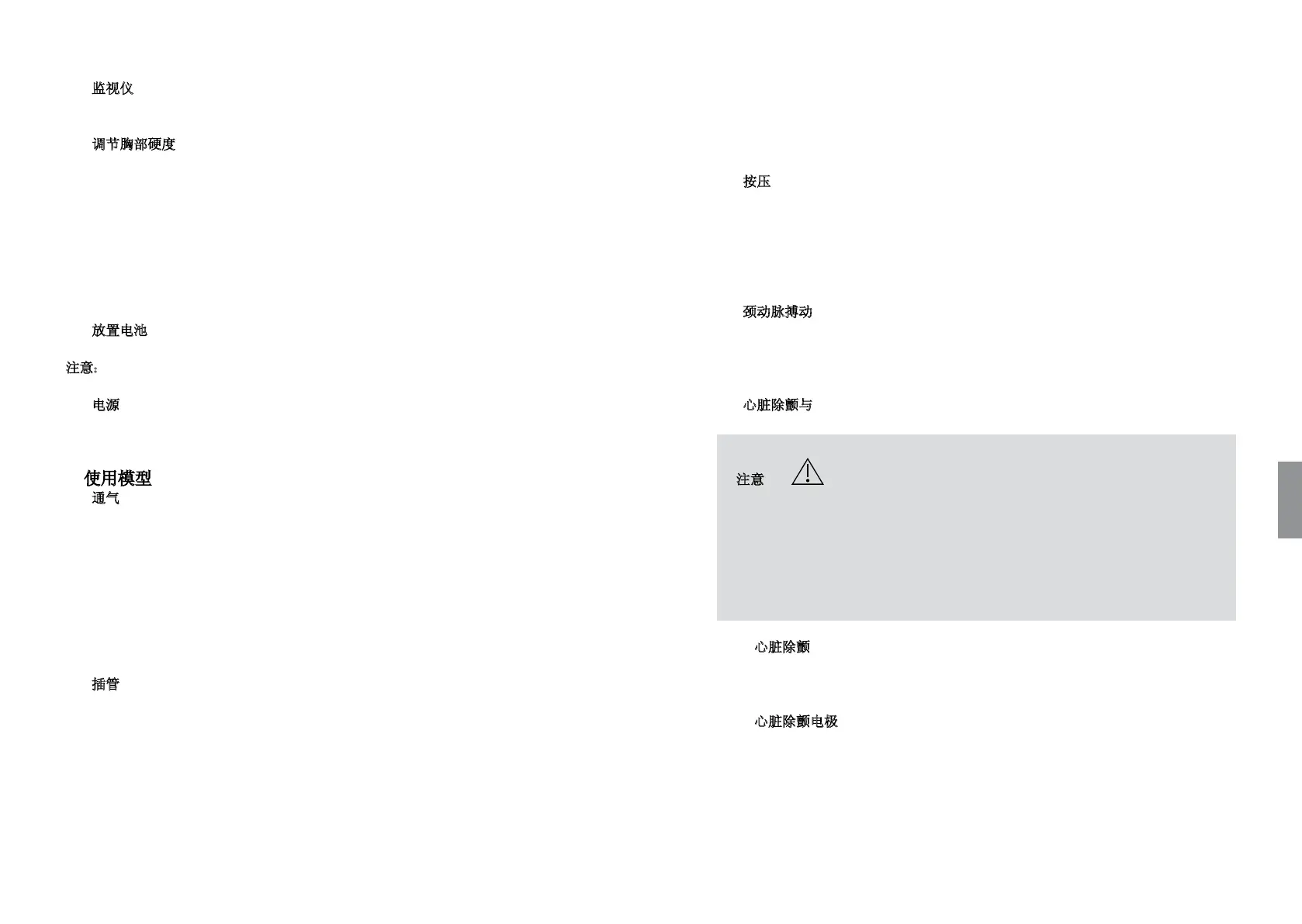 在 胸 部 按 压 期 间 ,或 者 当 使 用 ECG 控制功能手动模拟时,颈部两侧会感觉到颈动脉搏