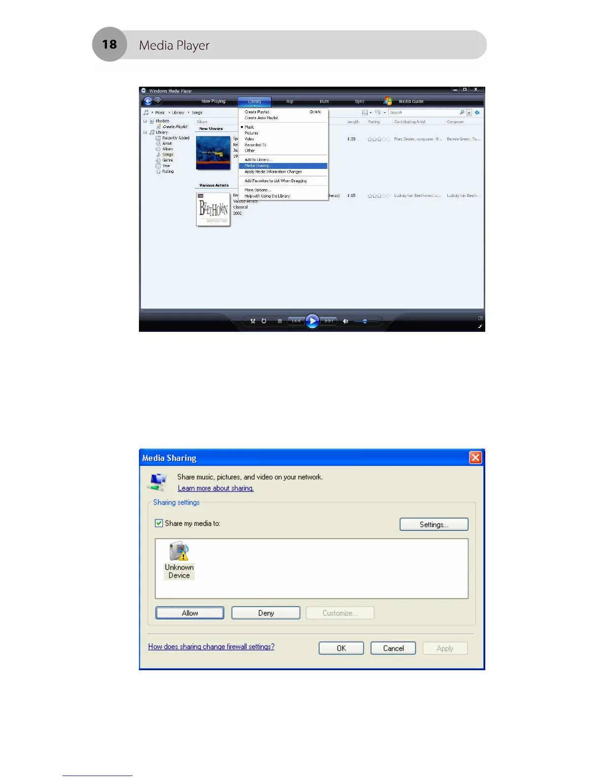 In to the ‘Media Sharing’ window, the radio will be listed as an unknown