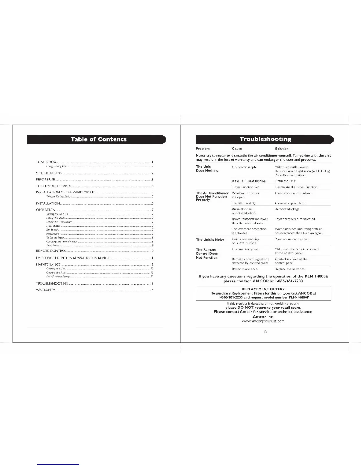 Amcor PLM12000E - Plasma 14000 BTU Table of Contents; Plasma 14000 BTU Troubleshooting