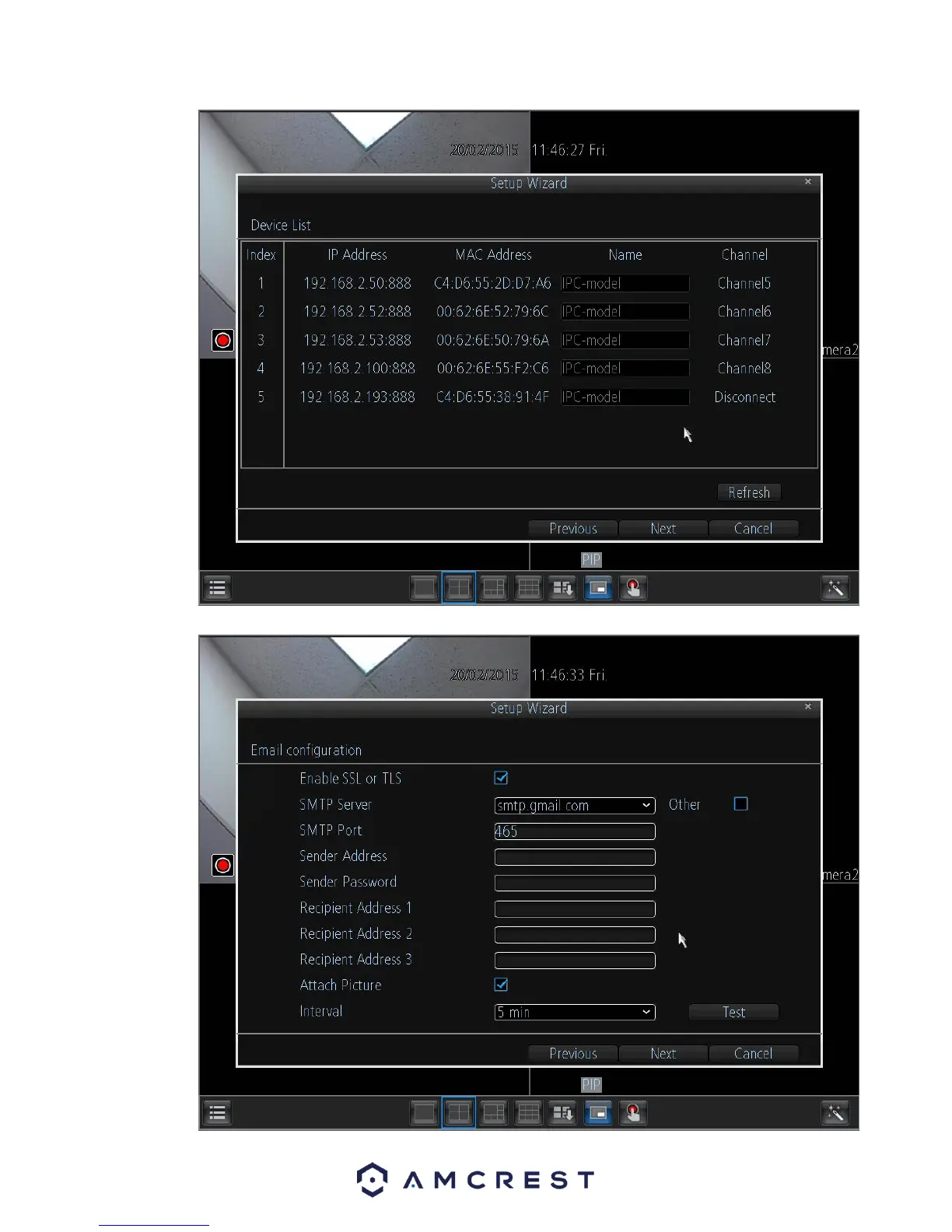 Amcrest 960H - Software Setup - Setup Wizard: Alerts & Remote; Device List and Email Configuration