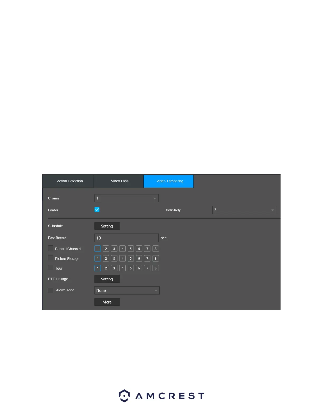 The tampering settings screen is where the NVR can be setup to notify the user any time a camera is