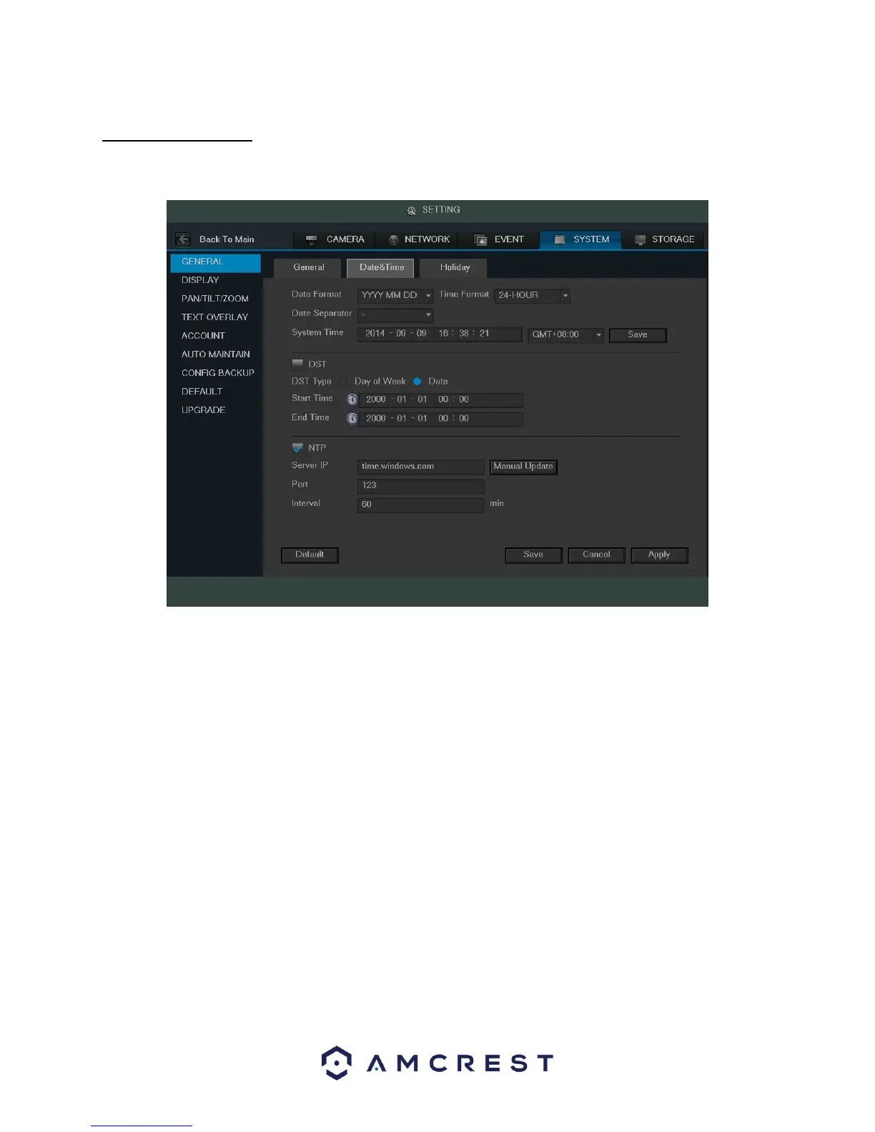 This screen displays date and time settings for the DVR. Below is a screenshot of the Date & Time settings screen: