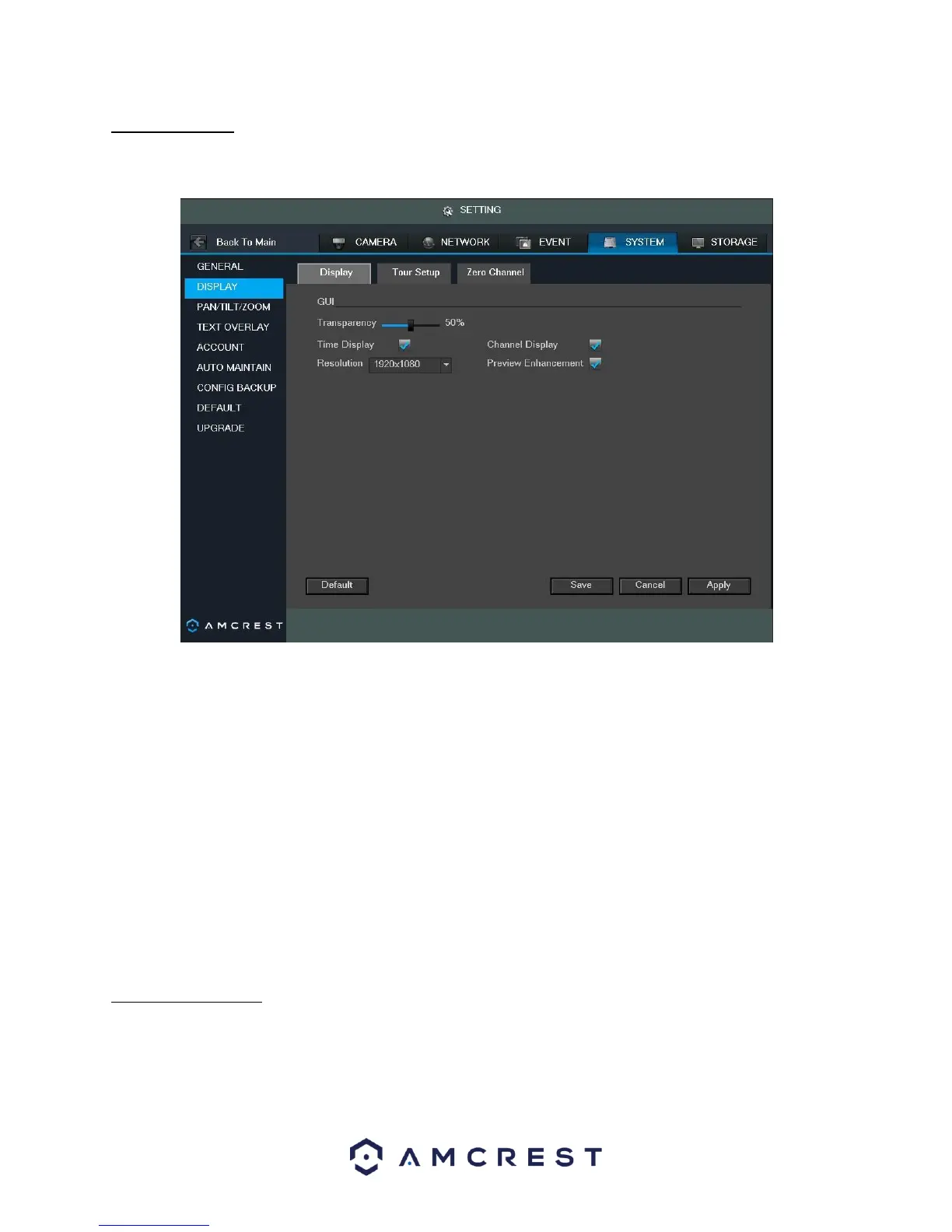 This screen is used to set display settings for the DVR. Below is a screenshot of the display settings screen:
