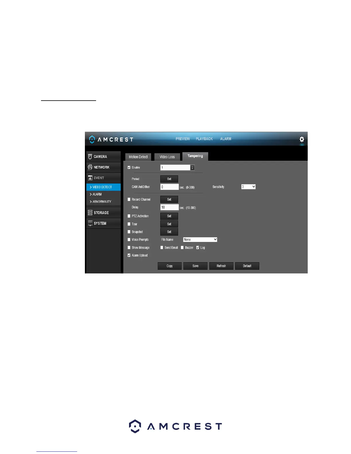 The tampering settings screen is where the DVR can be setup to notify the user any time a camera is tampered