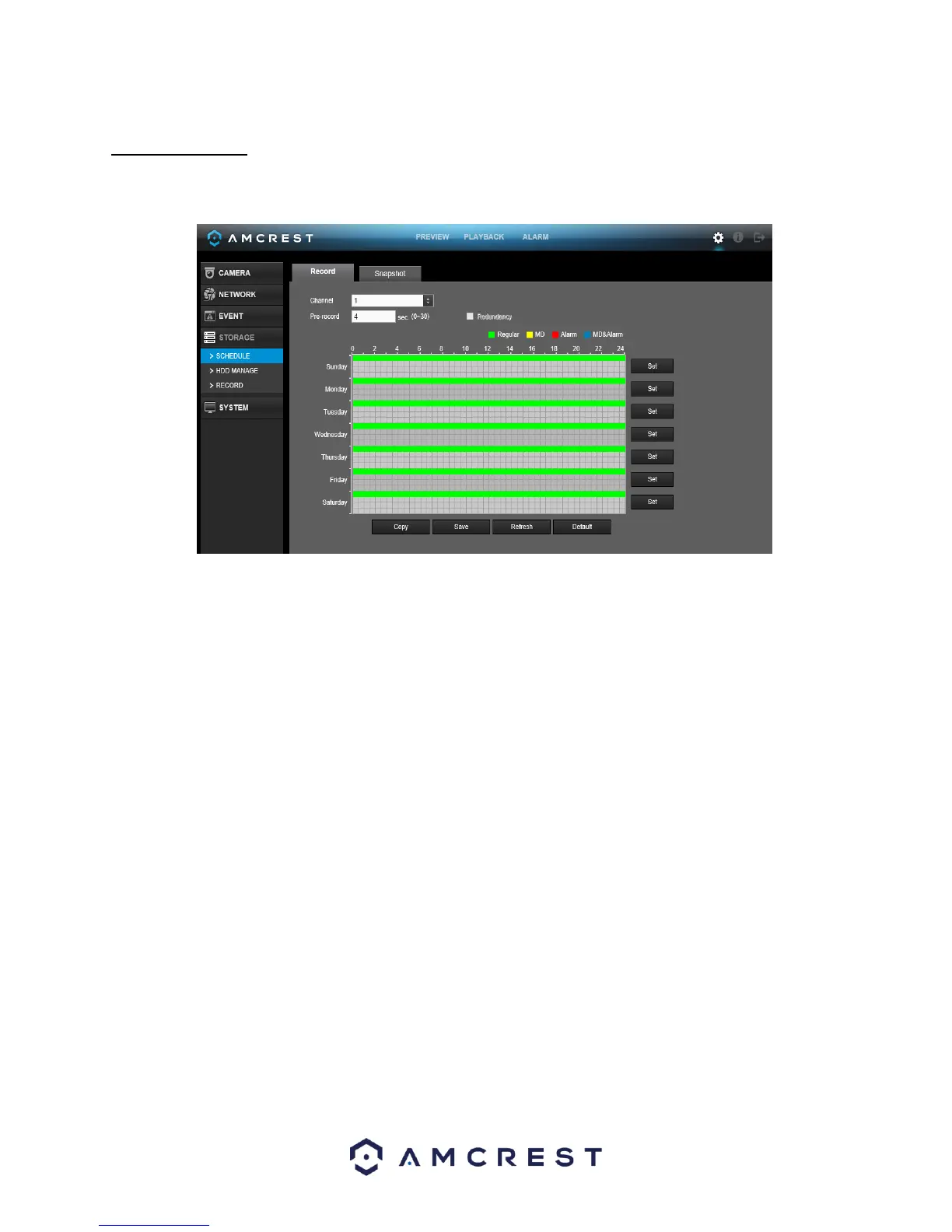 To set a recording schedule for your device, click on the set option located on the right of the day you wish to