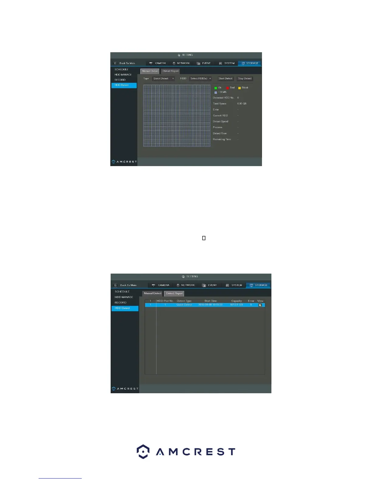 • Start Detect: This button started the HDD detection report. Stop Detect: This button stops the HDD