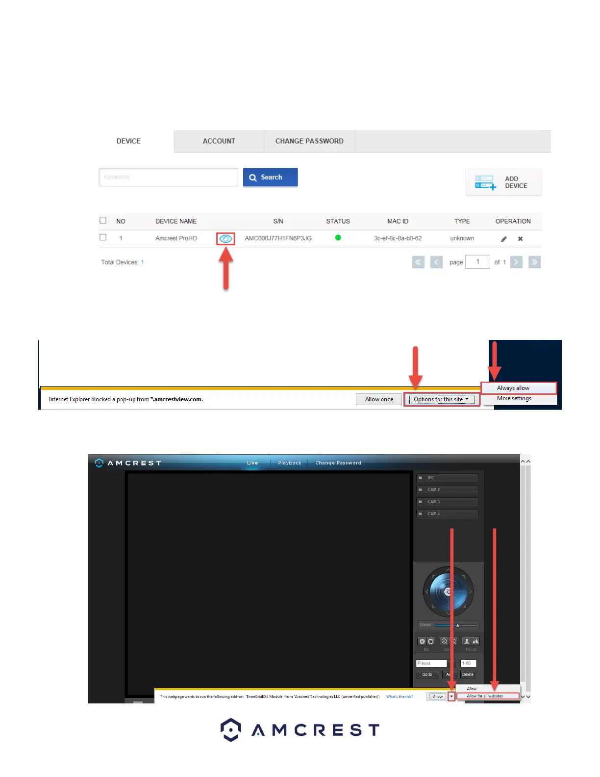 11. Your browser will give you a notification asking you to allow popups from AmcrestView.com. Click Options for