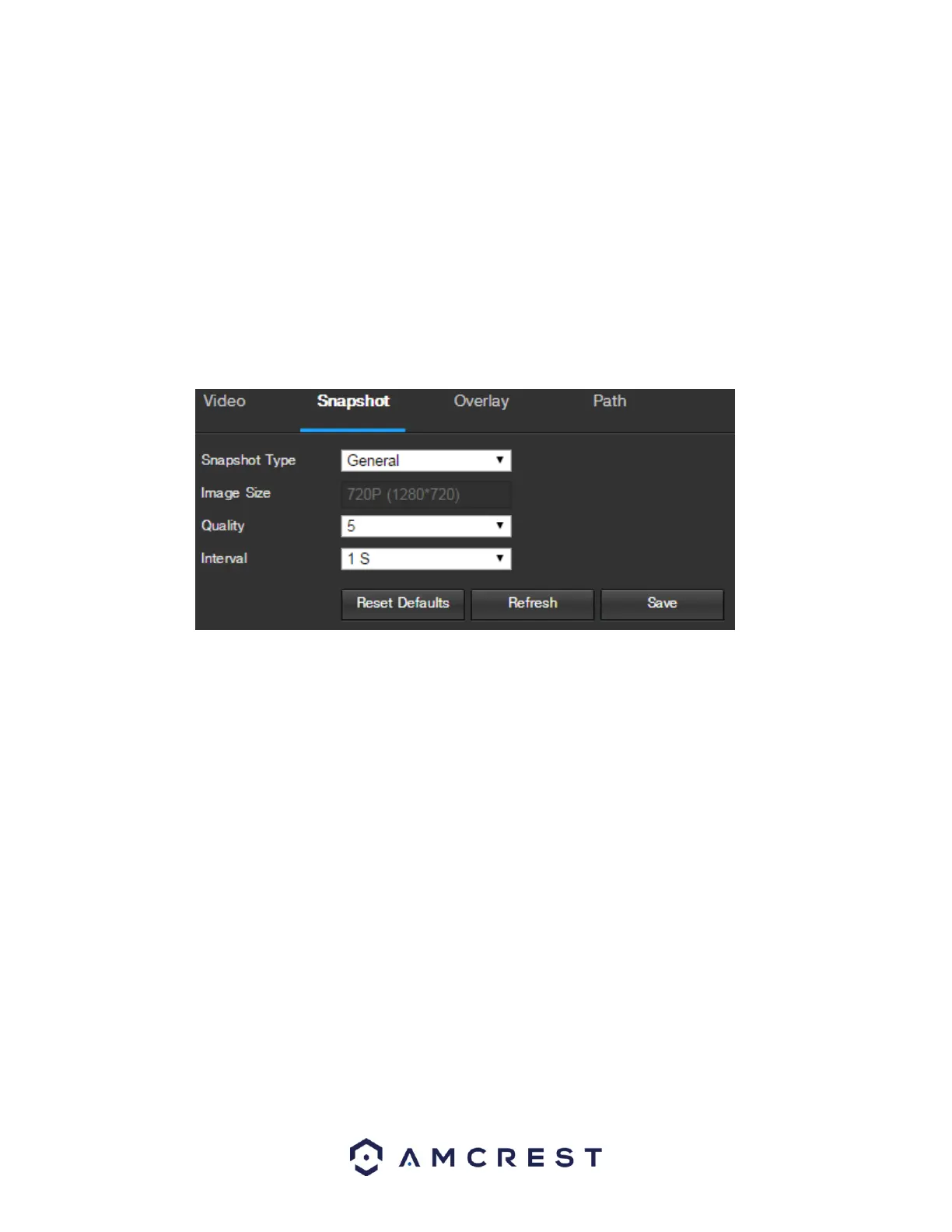 Below is an explanation for each of the fields on the Snapshot tab in the Video menu item: