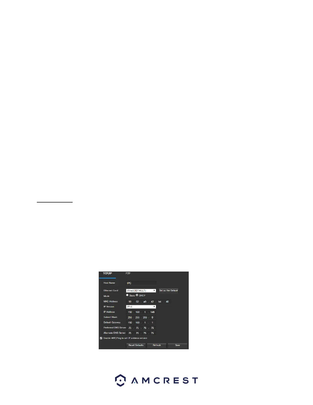 This screen allows for TCP/IP settings to be modified in order for the camera to establish a connection to the
