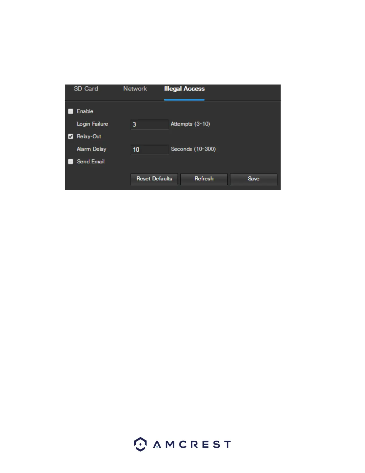 This tab allows the user to set the camera’s response to an Illegal Access related abnormality. Below is a