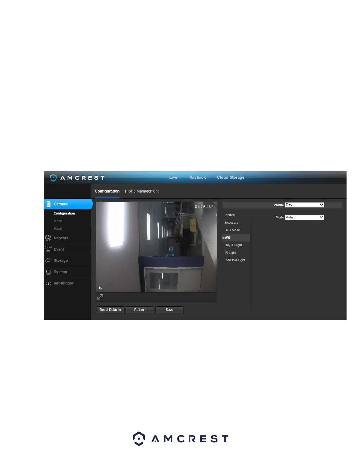 This dropdown box allows the user to select the white balance for the video feed. The different options are Auto, Sunny, Night,