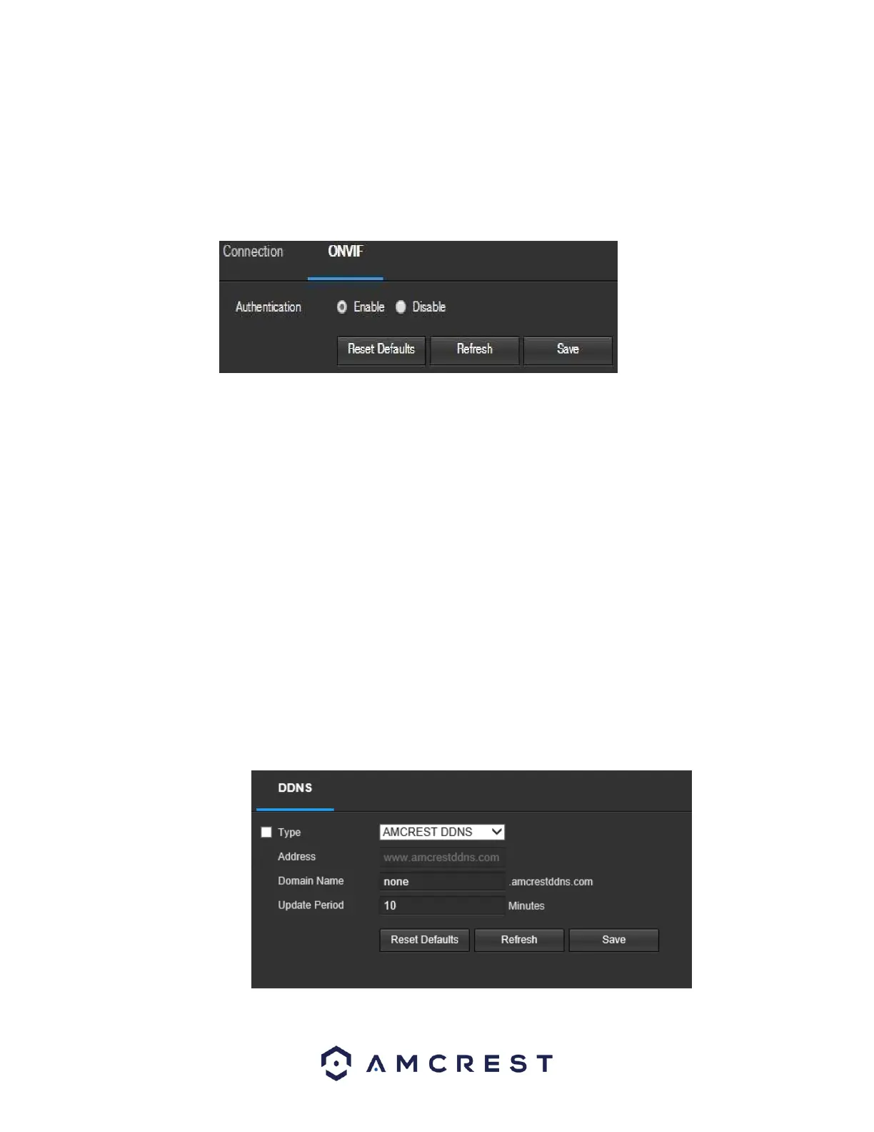 Below is a screenshot of the DDNS settings screen, configured to AmcrestDDNS: