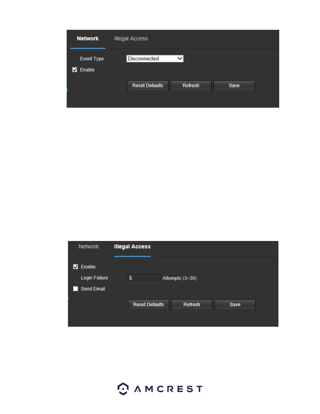 This tab allows the user to set the camera’s response to an Illegal Access related abnormality. Below is a screenshot of the