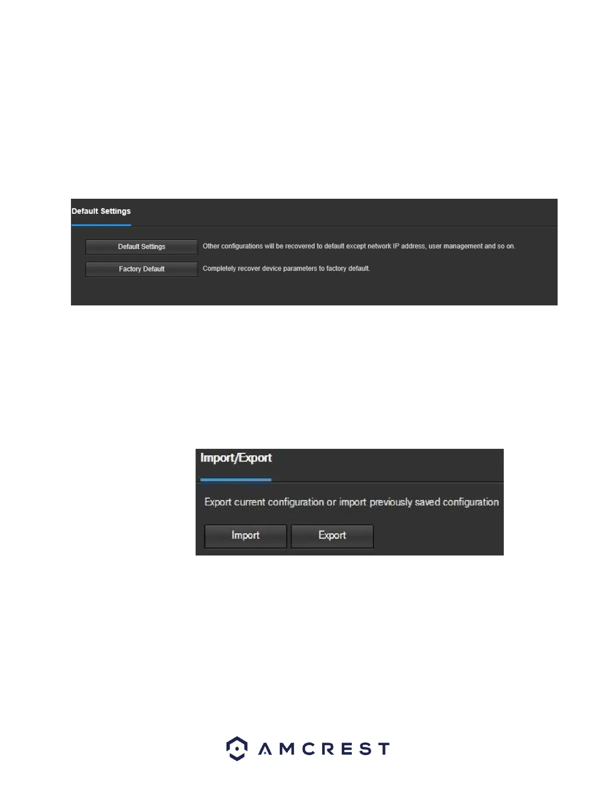This screen allows the user to import or export settings from the camera. Below is a screenshot of the