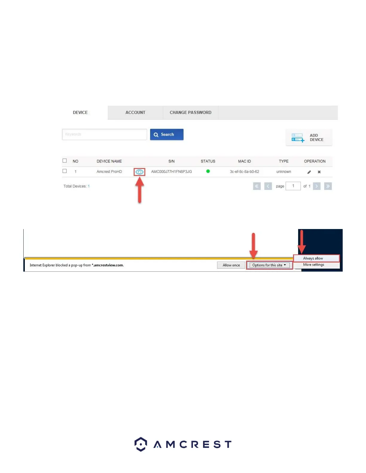 11. Your browser will give you a notification asking you to allow popups from AmcrestView.com. Click Options for
