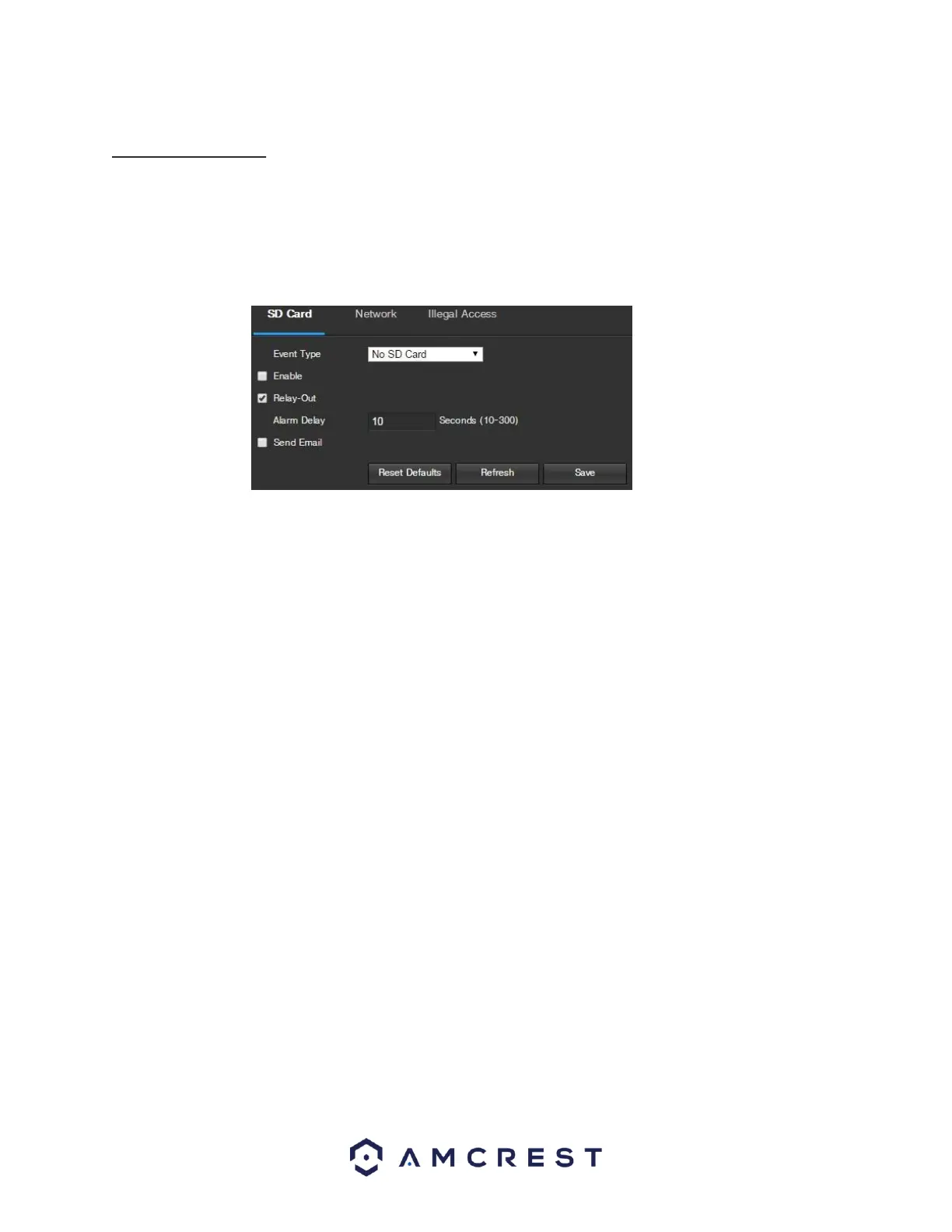 This tab allows the user to set the camera’s response to an SD card related abnormality. Below is a screenshot of