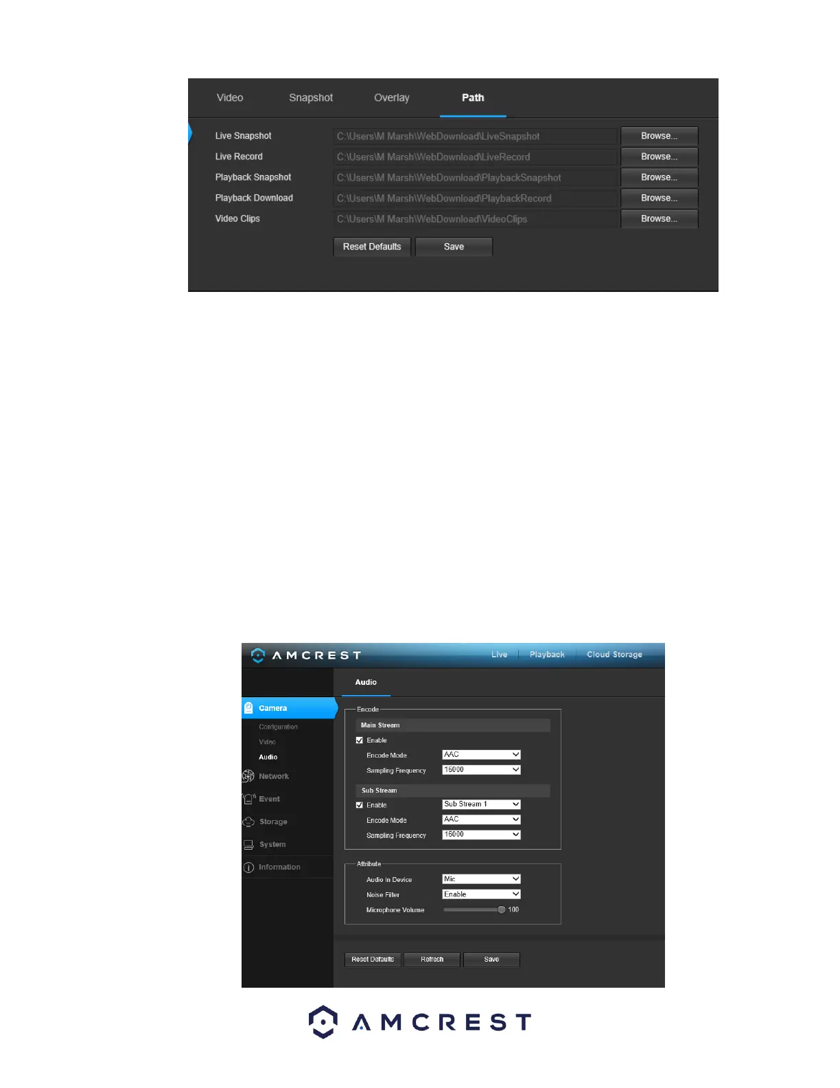 • The Live Snapshot field allows the user to select where to save live snapshots to. Click the Browse