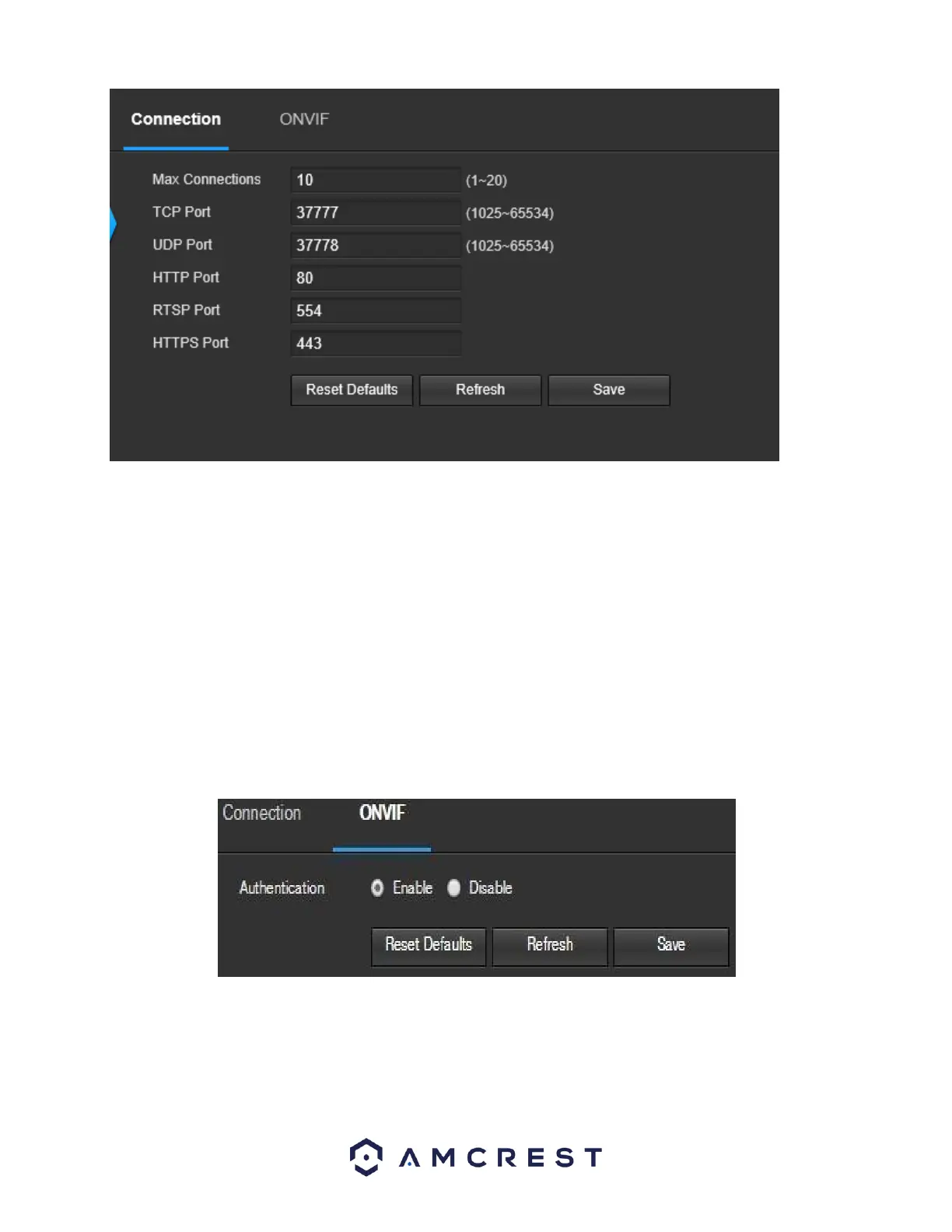 The ONVIF tab is where users can configure authentication via the ONVIF standard. Below is a screenshot of the ONVIF settings