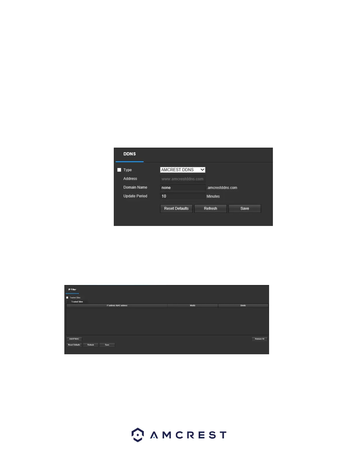 Below is a screenshot of the DDNS settings screen, configured to AmcrestDDNS: