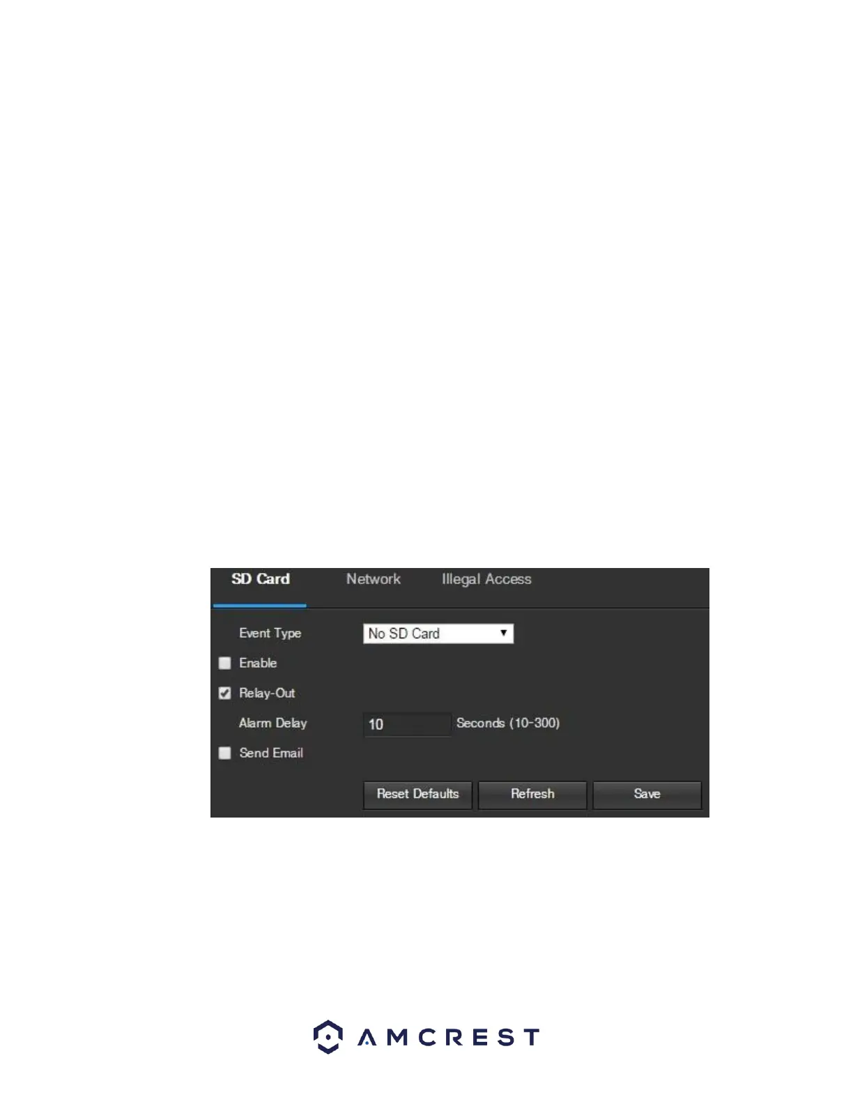 This menu allows the user to adjust abnormality event settings. This menu has 3 tabs: SD Card, Network, and Illegal Access.