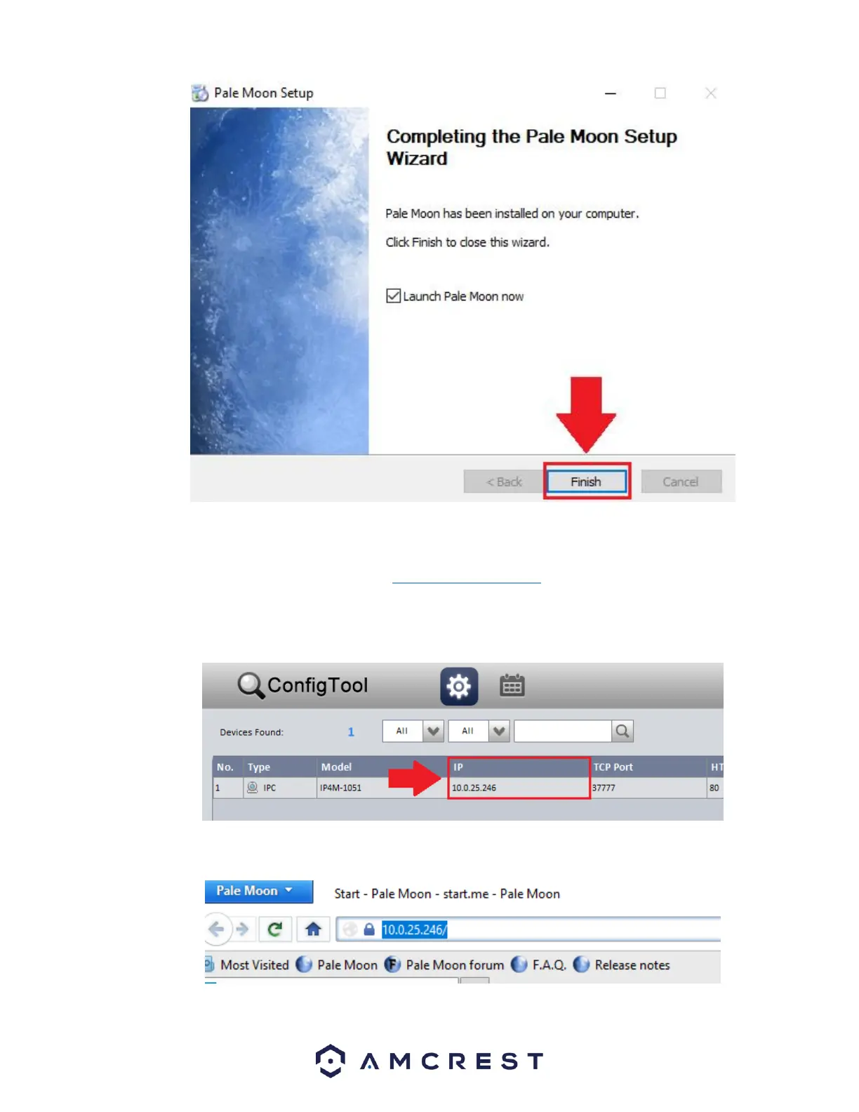 To access the web user interface, locate the IP address for your device using the Amcrest IP Config Tool. The Amcrest IP Config