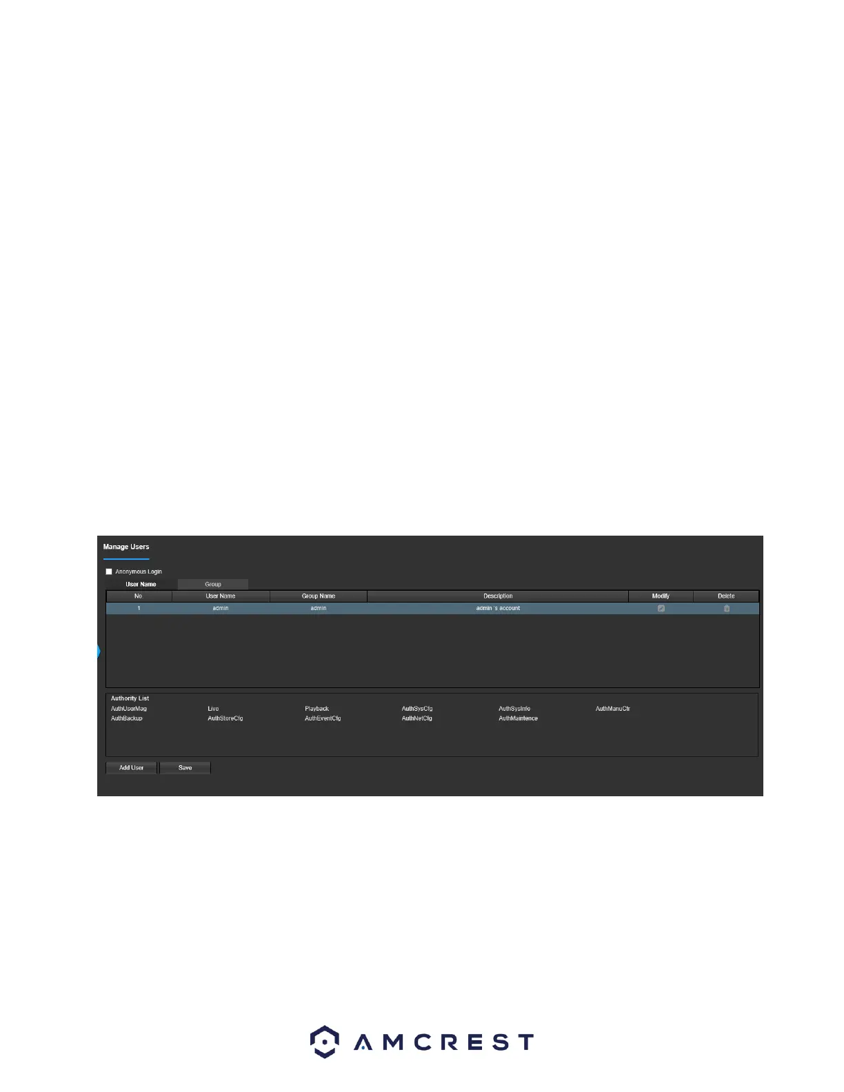 admin account which has all rights/authorities. Additional accounts can be created on this screen. Below is a