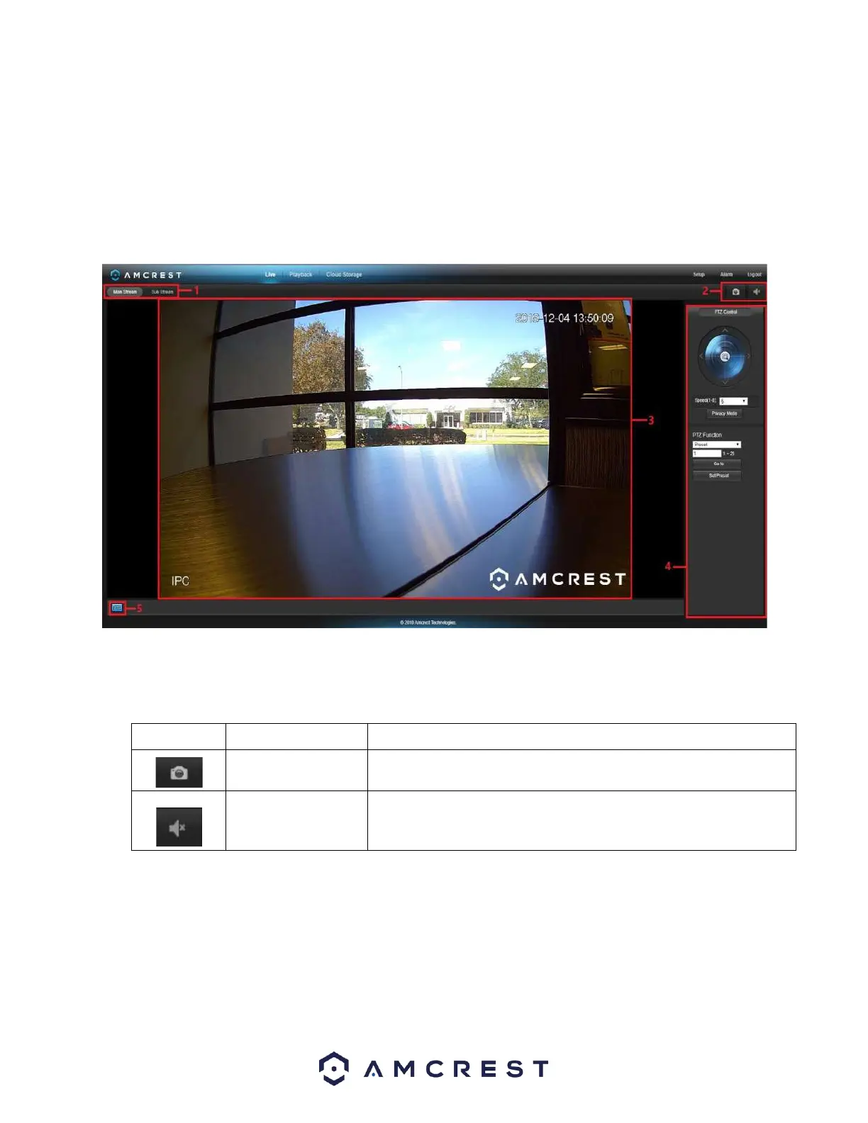 Section 5: This button allows the user to show or hide the pan tilt control panel on the live view screen.